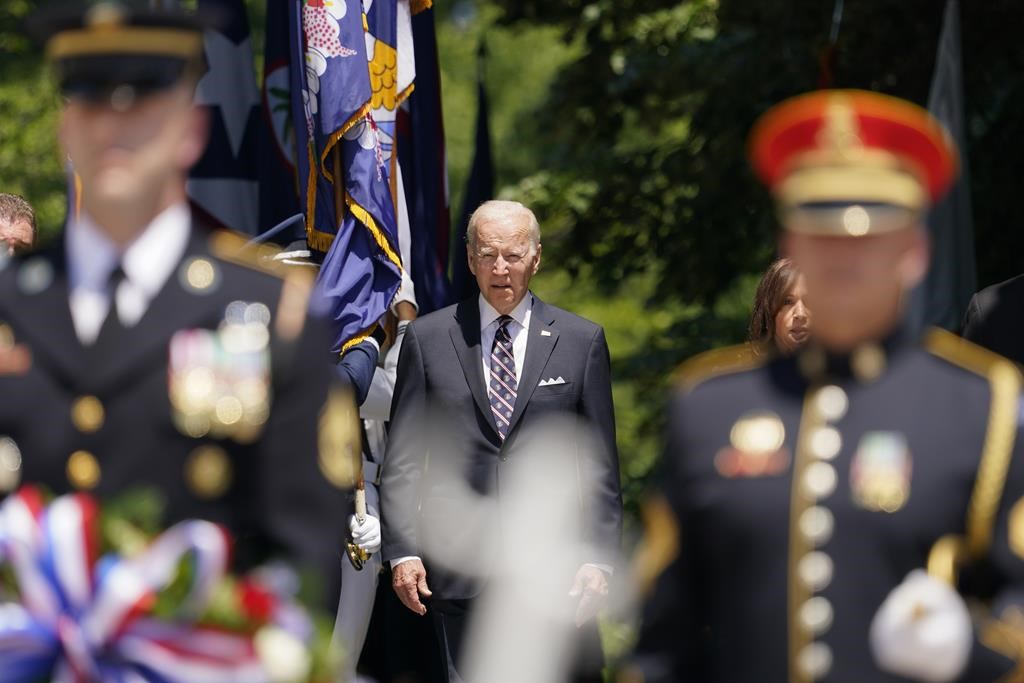 Au garde-à-vous sous un ciel sans nuage dans la chaleur de la fin mai, M. Biden a fait un salut après avoir déposé devant la tombe la couronne de fleurs multicolores enveloppées de ruban rouge, blanc et bleu.