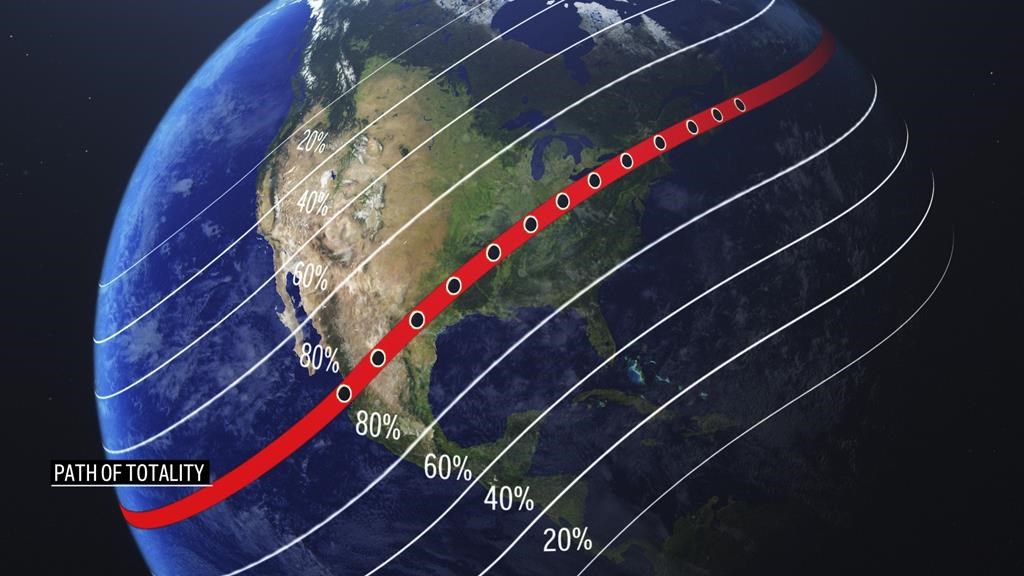 La limite nord de l'ombre glissera sur une étroite bande du sud de l'Ontario, manquant de peu Toronto, puis se dirigera vers Montréal, arrivant pour une brève éclipse totale vers 15 h 26.