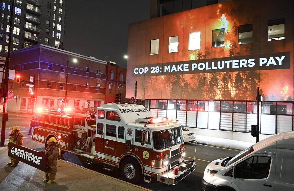 MONTRÉAL — Quelques heures avant le début de la COP28, des activistes de Greenpeace ont projeté des images de feu de forêt sur la façade du bureau du ministre de l’Environnement, Steven Guilbeault, à Montréal, à qui ils demandent de faire payer l’industrie fossile pour les dommages de la crise climatique.