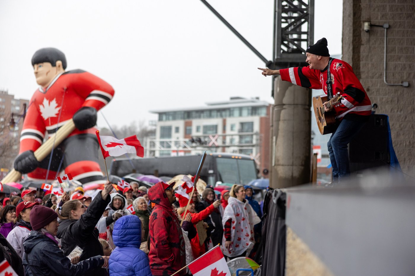 À Halifax, des centaines de personnes ont bravé une pluie battante pour participer à un rassemblement devant le centre de congrès, où ils se sont tenus dans des flaques d'eau de quelques centimètres de profondeur, en chantant au son d'un groupe de reprises interprétant des succès de Tragically Hip et d'autres classiques canadiens.