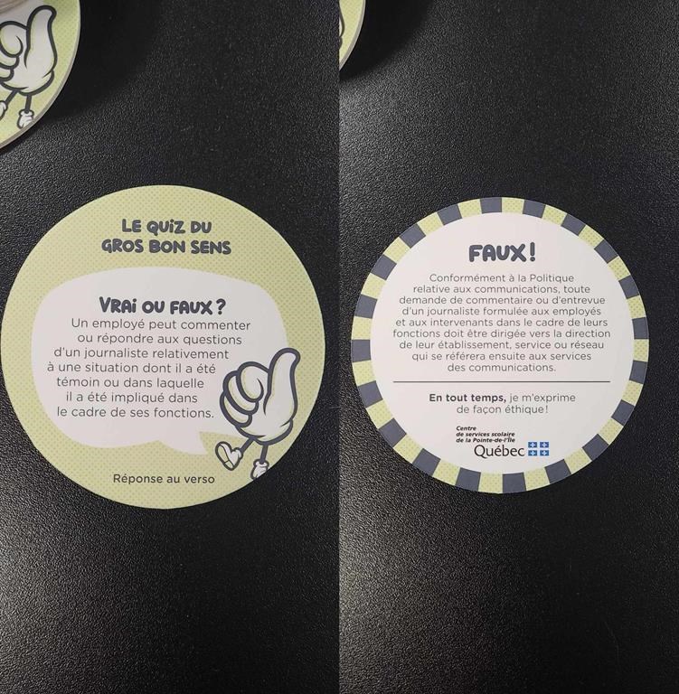 «Dans l'idée d’accompagner nos employés sur certaines questions éthiques, nous avons créé un jeu-questionnaire dont les mises en situation se basent sur de vraies décisions tranchées par des tribunaux, le Code civil du Québec ou notre Politique des communications», écrit la porte-parole du centre de services de la Pointe-de-l’Île, Valérie Biron, dans un courriel à La Presse Canadienne.