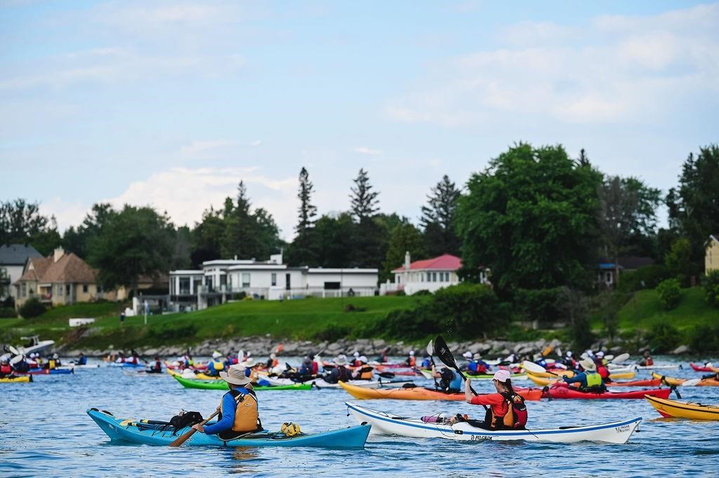 Des kayakistes pagaient sur le fleuve Saint-Laurent pour amasser des fonds