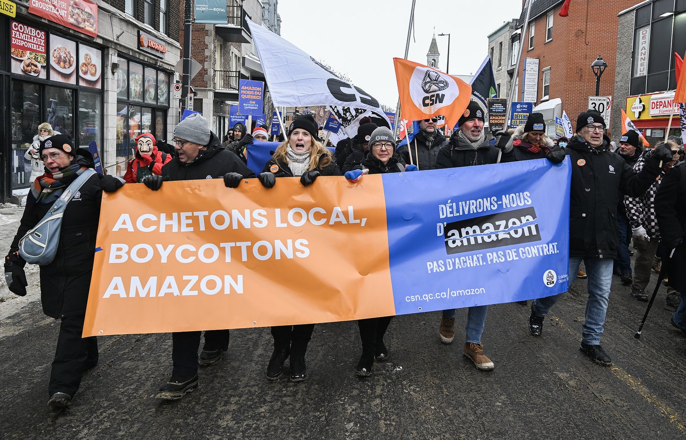 MONTRÉAL — Des manifestants accusant Amazon de bris de syndicat se sont rassemblés samedi au centre-ville de Montréal pour continuer à appeler au boycottage de l'entreprise après qu'elle a décidé de fermer ses entrepôts du Québec en janvier.