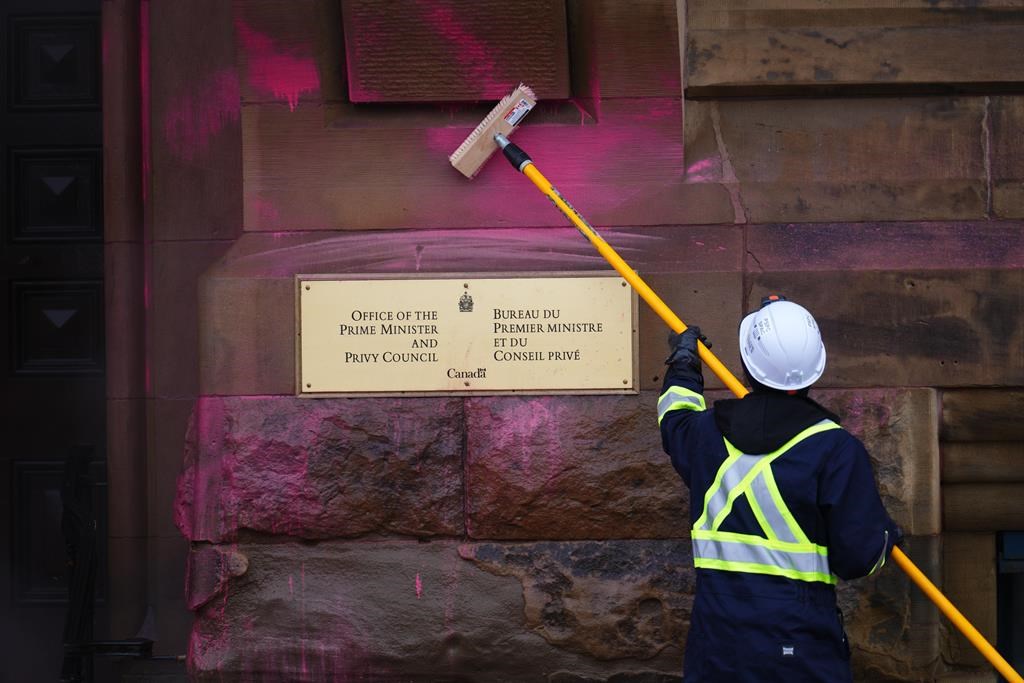 OTTAWA — Cinq personnes font face à des accusations de méfait après que le bâtiment abritant le bureau du premier ministre Justin Trudeau a été aspergé de peinture rose.