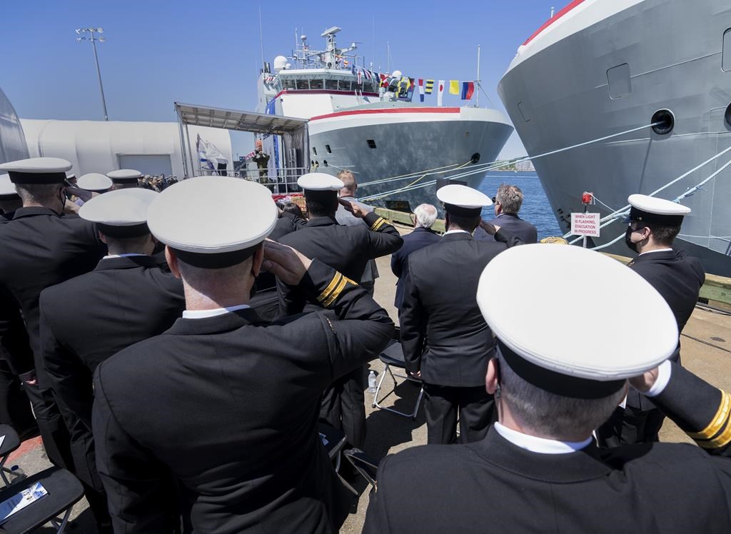 HALIFAX — Des membres de la Marine royale canadienne et des dignitaires des gouvernements fédéral et provincial se sont réunis dimanche sur le front de mer d’Halifax pour la cérémonie de baptême de deux des nouveaux navires de patrouille extracôtiers et arctiques du Canada.