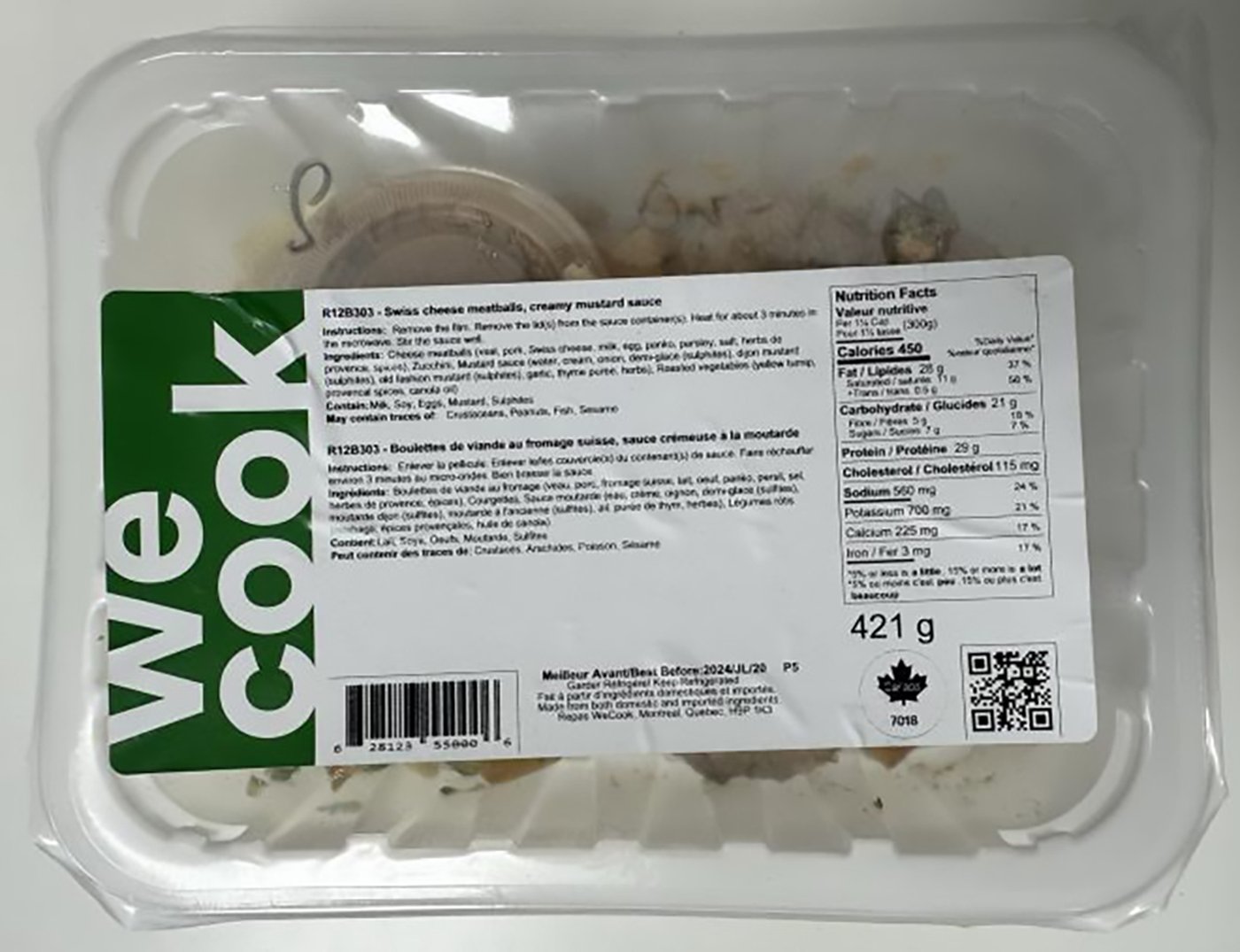 L'agence indique que le rappel s'applique aux boulettes de viande au fromage suisse de marque WeCook avec une sauce crémeuse à la moutarde, ayant une date de péremption du 20 juillet et dont le numéro UPC est le 6 28123 55000 6.