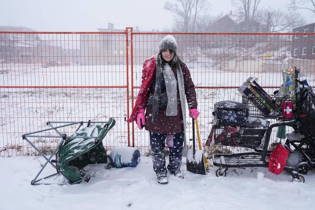 Plusieurs individus pouvaient être vus se frottant les mains nues par une journée extrêmement froide, d’autres blottis sur des chaises de fortune adossées à une clôture. Une femme âgée enveloppée dans des couvertures et assise au milieu du trottoir a fait une scène à propos de son besoin de logement.