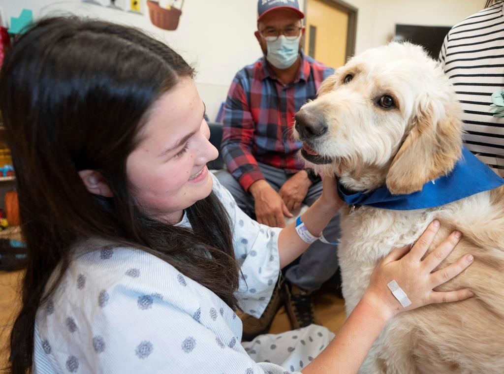 Kitchi est le nouveau membre de l'équipe de zoothérapie de l'hôpital. En poste depuis janvier, le goldendoodle de deux ans rencontre en ce matin de fin d'hiver (ou de début de printemps, pour les plus optimistes) Maève, une adolescente de 13 ans qui était hospitalisée depuis une semaine pour une mystérieuse infection qui l'a subitement envoyée à l'unité des soins intensifs.