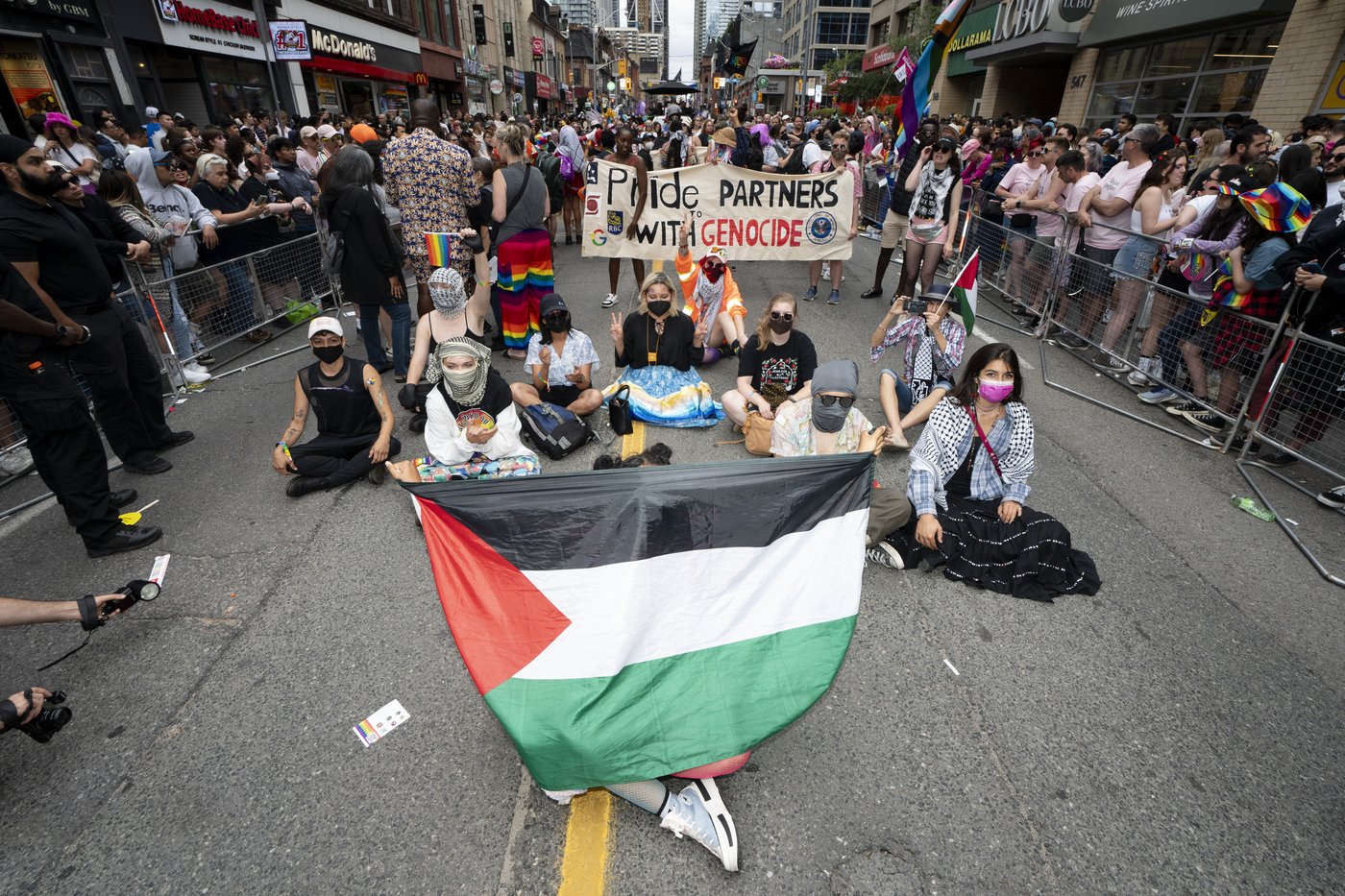 Les manifestants étaient assis au milieu de la rue Yonge, un groupe arborant un drapeau palestinien, d'autres brandissant des banderoles sur lesquelles on pouvait lire «La Fierté s'associe au génocide» et «Stop au pinkwashing».