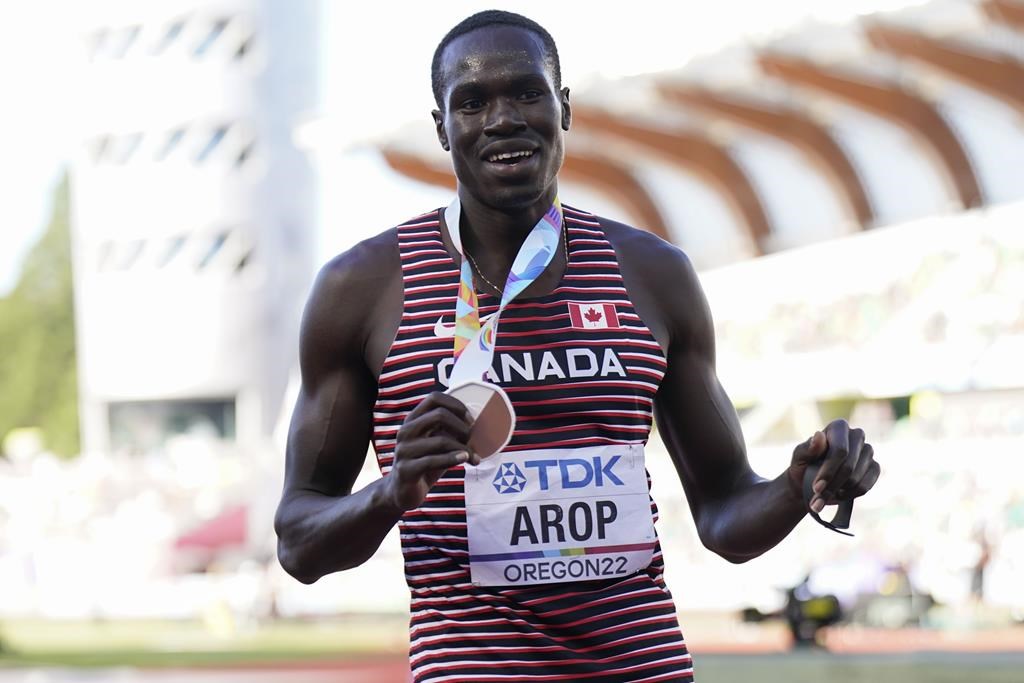 EUGENE, Ore. — Le Canadien Marco Arop a obtenu son premier titre mondial grâce à une médaille de bronze à l'épreuve du 800 mètres, samedi, lors des Championnats du monde d'athlétisme.