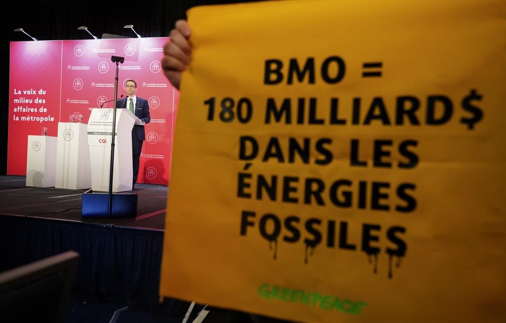 Le président de la BMO au Québec, Grégoire Baillargeon, s’adressait à des centaines de membres de la communauté des affaires de la métropole en expliquant que sa banque est «motivée chaque jour» dans la lutte au changement climatique, lorsque trois militants de Greenpeace l’ont interrompu.