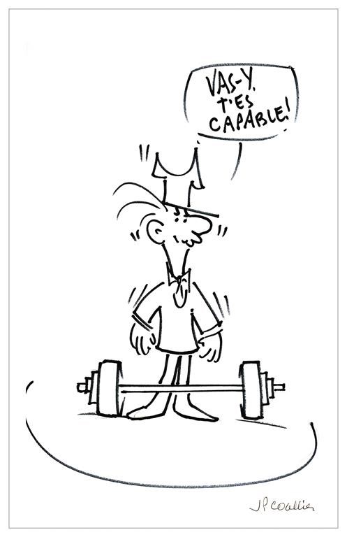 Certains des exercices proposés aux patients sont illustrés de caricatures dessinées par l'animateur bien connu Jean-Pierre Coallier. On propose par exemple d'articuler et de répéter «100 fois des mots simples» et de faire bouger «tout ce qui bouge! 10 fois 100 fois par jour +++».