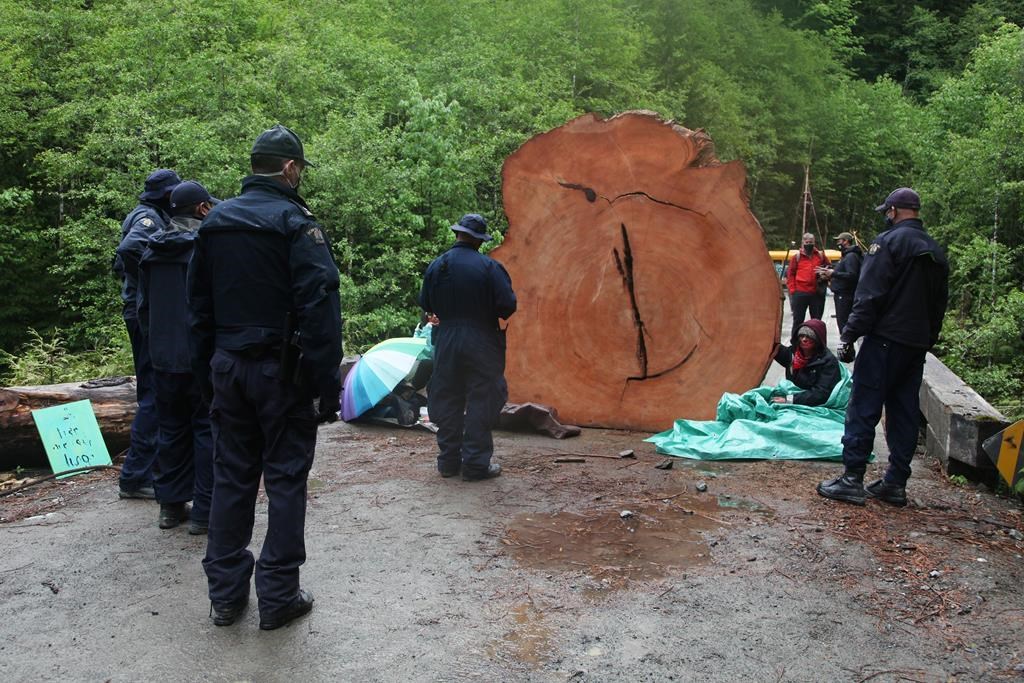 Les manifestants contre l'exploitation des vieilles forêts sur l'île de Vancouver allèguent que la police a fait usage d'une force excessive, comme pulvériser du gaz poivré sur le visage des gens à bout portant, ainsi que les pousser et les jeter au sol.