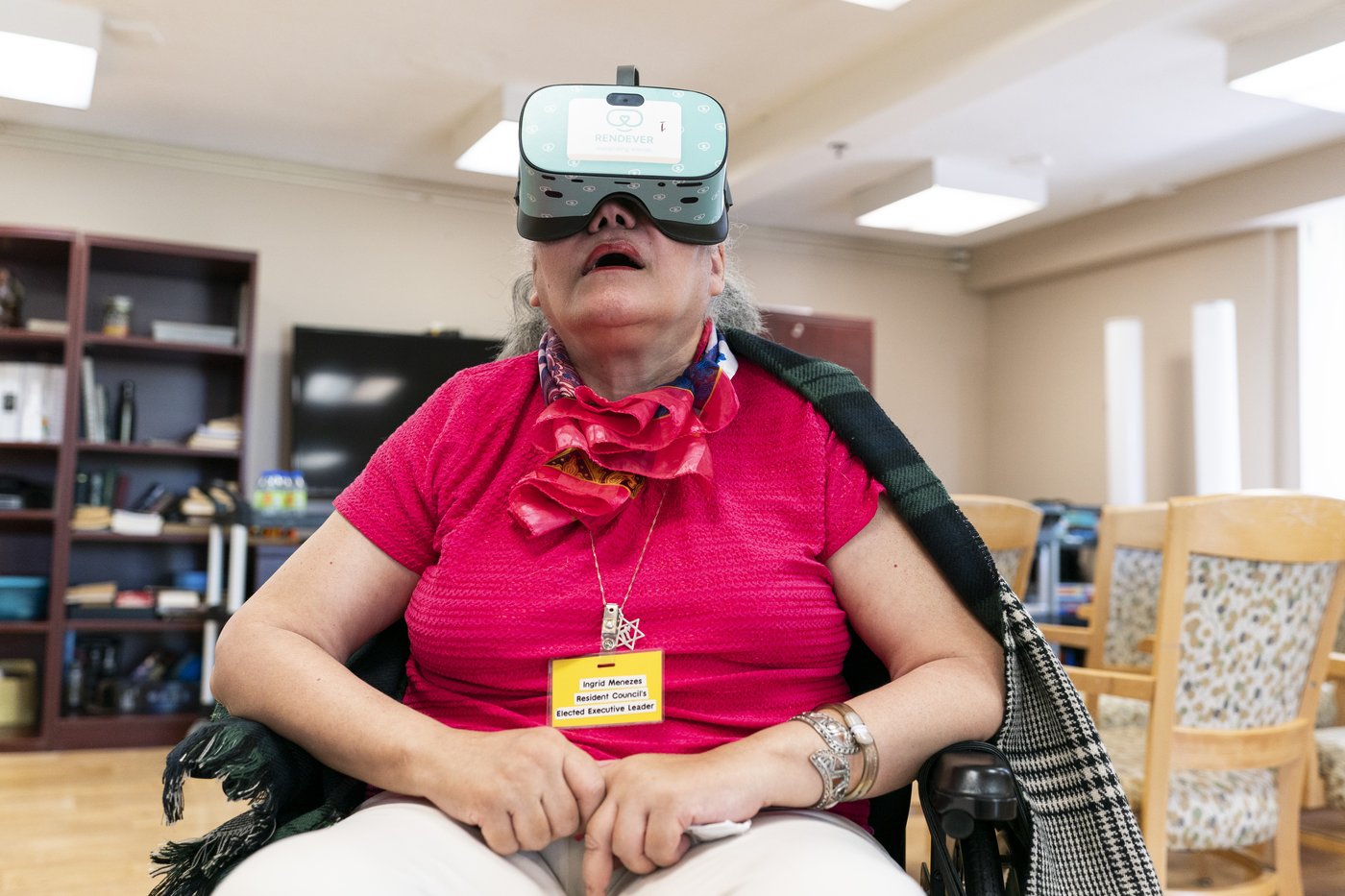 Mme Menezes a déménagé au Kennedy Lodge, dans l'est de Toronto, après une opération au cerveau il y a environ cinq ans. Elle fait partie d'un nombre croissant de résidents de soins de longue durée au Canada qui bénéficient de la réalité virtuelle dans le cadre de leurs programmes de loisirs.