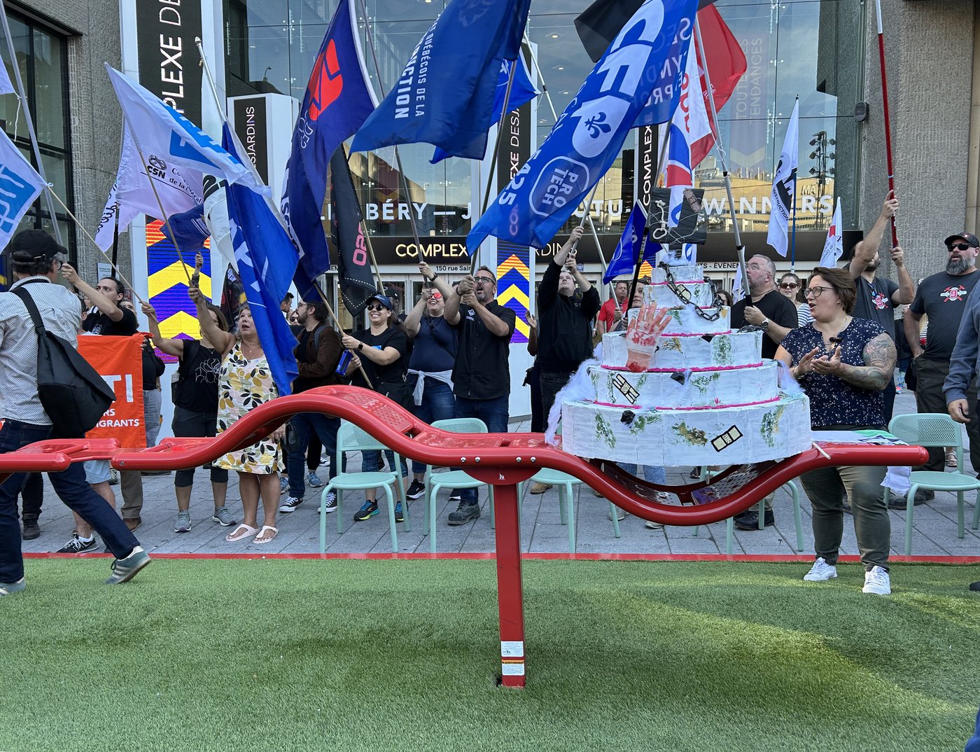 La manifestation a réuni des participants de plusieurs organisations syndicales: FIQ, APTS, CSQ, CSN, CSD, FTQ, FAE, en plus de l'Union des travailleuses et travailleurs accidentés ou malades.