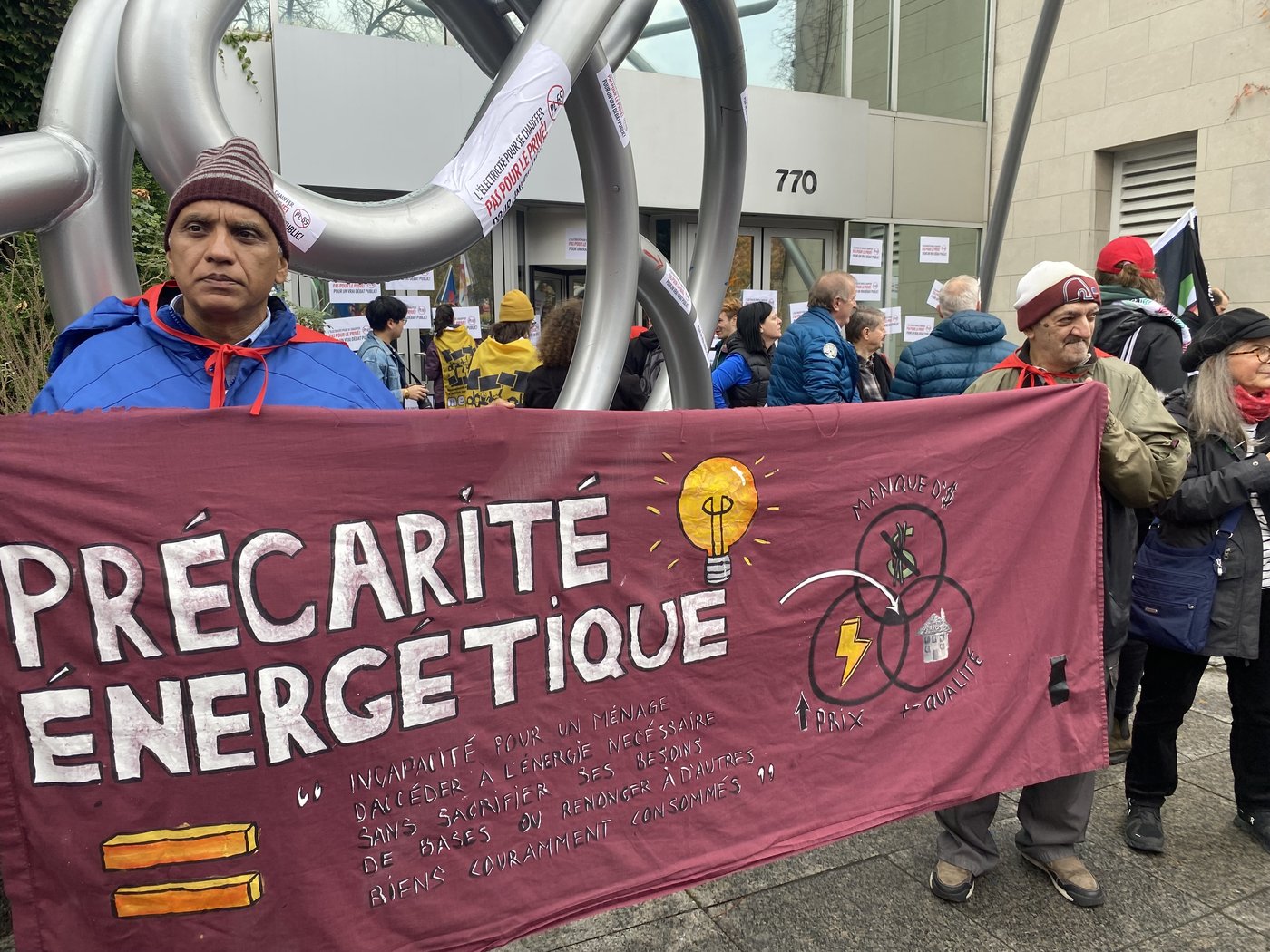 Parmi eux, Daniel Tremblay tenait une banderole sur laquelle figurait l’expression «précarité énergétique», accompagnée d’une définition: «Incapacité pour un ménage d’accéder à l’énergie nécessaire sans sacrifier ses besoins de base ou renoncer à d’autres biens couramment consommés».