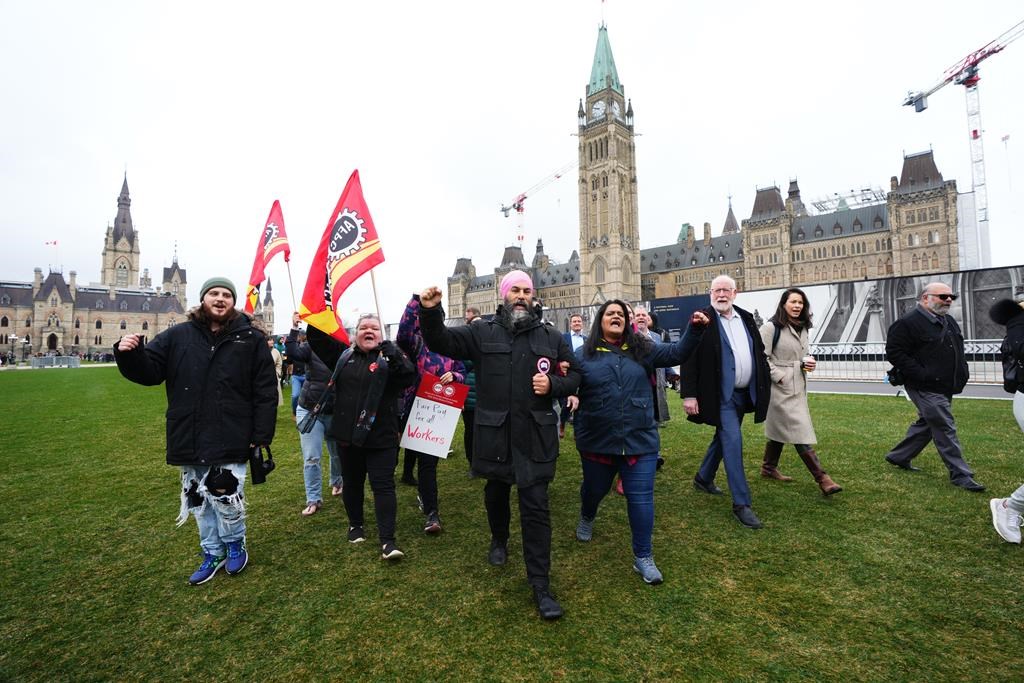 Le chef néo-démocrate Jagmeet Singh est allé marcher avec les fonctionnaires brièvement et serrer leurs mains avant de se rendre à la réunion de son caucus.