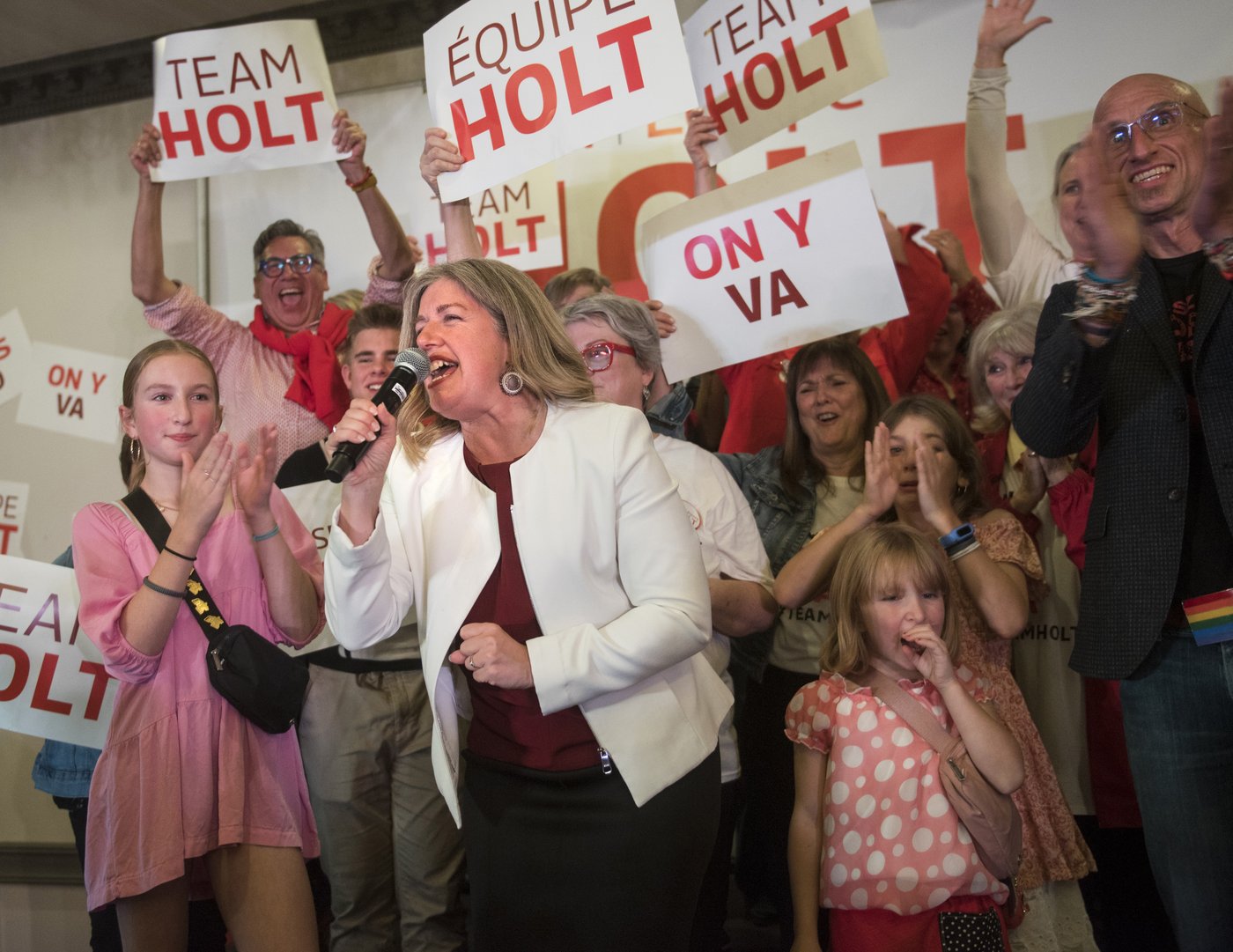 Entourée de ses trois jeunes filles sur scène à Fredericton, Mme Holt, la première femme désignée première ministre de l’histoire du Nouveau-Brunswick, a prononcé un discours de victoire bilingue qui rendait hommage aux pionnières de la politique provinciale.