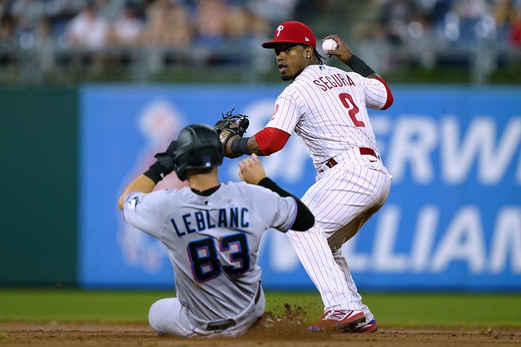 PHILADELPHIE — Le Québécois Charles Leblanc a cogné deux coups sûrs dont un simple d'un point mercredi à Philadelphie, où les Marlins ont toutefois été battus 4-3 par les Phillies.