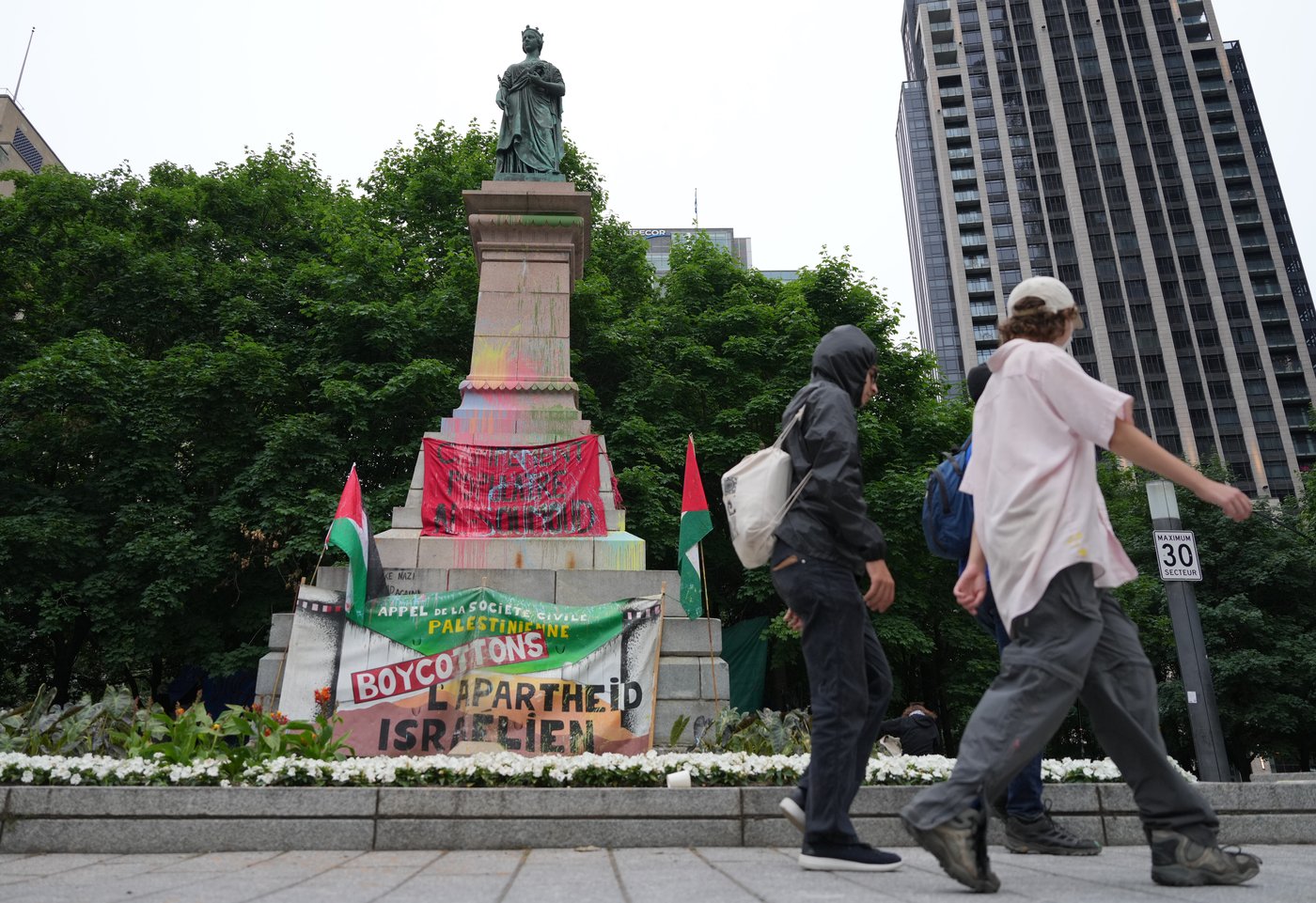 MONTREAL — Des manifestants propalestiniens et des contre-manifestants se sont affrontés aujourd'hui sur une place du centre-ville de Montréal, où un nouveau campement pour protester contre la guerre dans la bande de Gaza a été installé au cours de la fin de semaine.