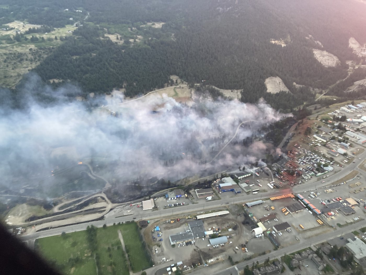 Des vidéos partagées sur les réseaux sociaux montrent de la fumée s'échappant derrière des entreprises et des maisons, avec un avion larguant un produit ignifuge rouge. Des photos semblent montrer au moins une entreprise en feu.