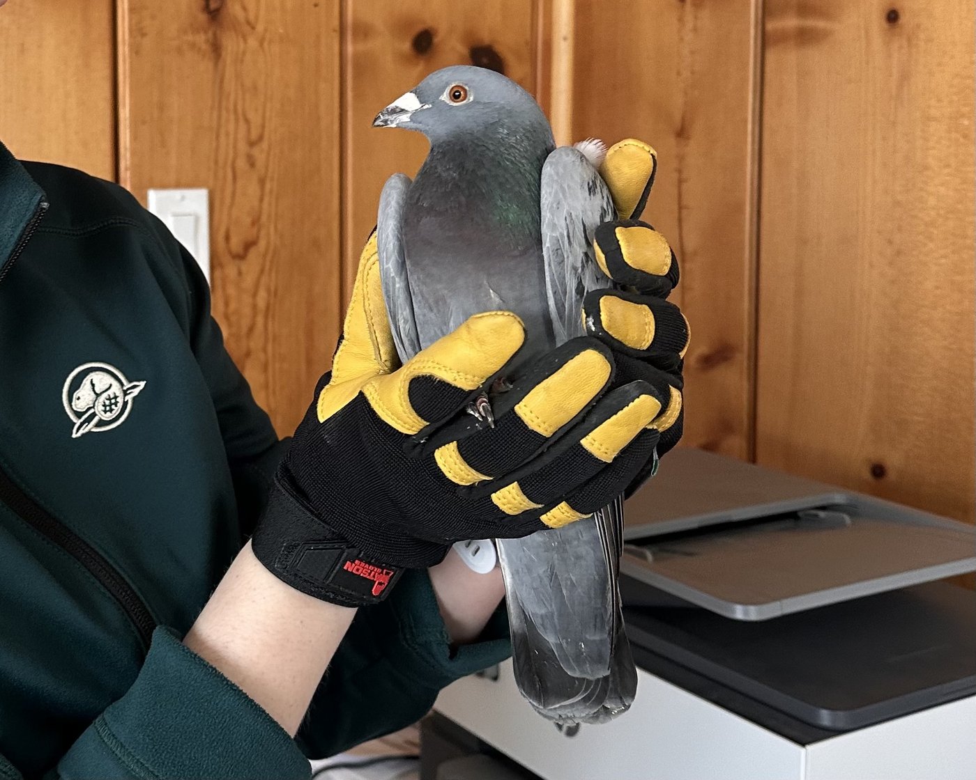 Selon Mme Penn, le 24 mars, il faisait brumeux et pluvieux lorsque les employés ont repéré un pigeon sous le porche du bâtiment principal de Parcs Canada. Lorsqu'ils trouvent des animaux blessés, les employés n'interviennent généralement pas auprès d'eux, mais Mme Penn a vu les bagues de l'oiseau sur ses pattes.