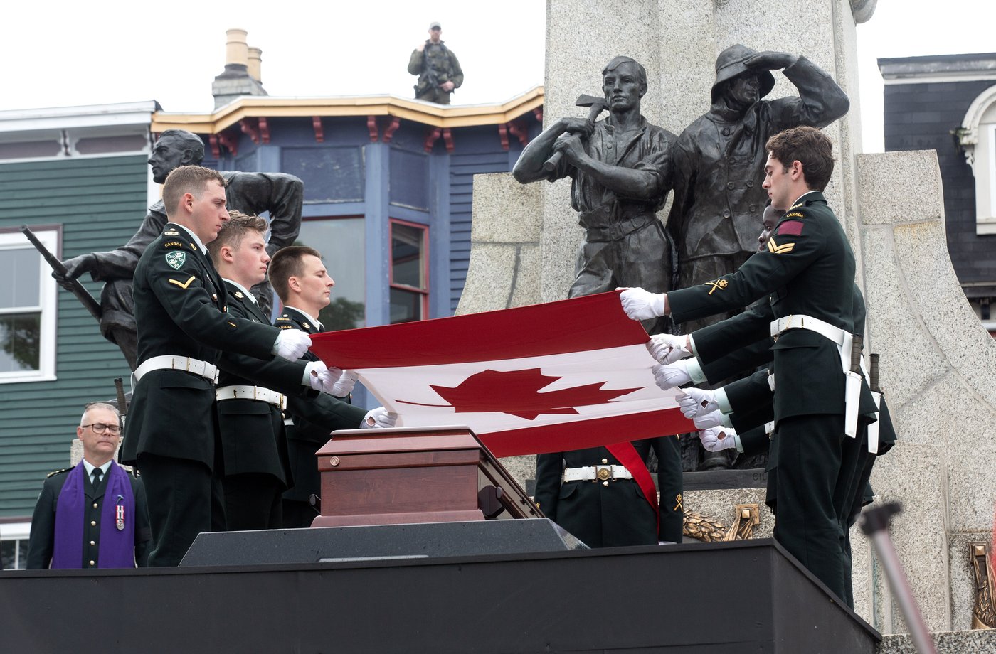 Le premier ministre de Terre-Neuve-et-Labrador, Andrew Furey, a agi comme le plus proche parent du soldat inconnu, et il a marché derrière le cercueil alors qu'il montait les marches vers le monument national, qui présente une statue d'une femme tenant une torche enflammée haut dans le ciel avec sa main gauche, et une épée pointée vers le sol à sa droite.