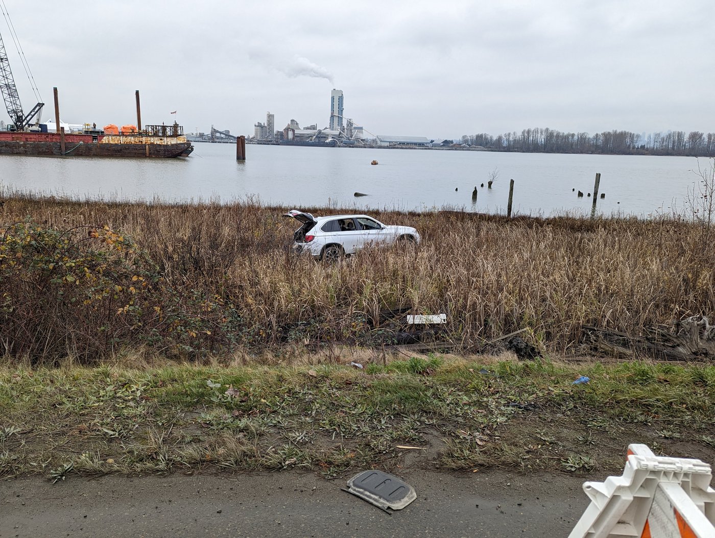 Des agents sont intervenus le 29 novembre sur River Road, où ils ont découvert une voiture bloquée sur le rivage du fleuve Fraser.