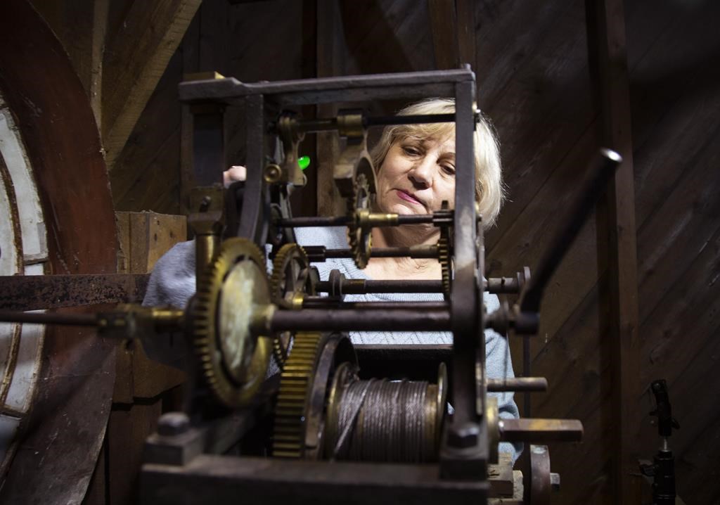 Liudmyla Pass, 68 ans, était à Terre-Neuve depuis moins d'un mois lorsqu'elle a gravi mardi les escaliers menant à la tour de l'horloge longtemps silencieuse de la ville côtière de Carbonear, armée de ses outils et de cinq décennies d'expertise.