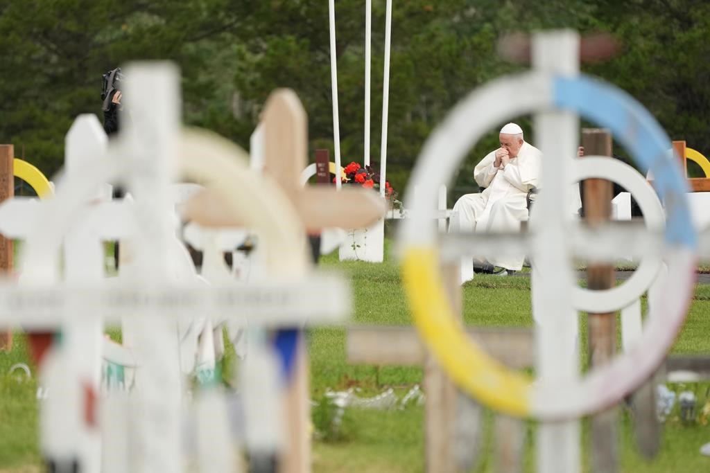 Je vous remercie de m’avoir fait entrer au cœur de tout cela, d’avoir extrait les lourds fardeaux que vous portez en vous, d’avoir partagé avec moi ce souvenir poignant. Aujourd'hui, je suis ici, sur une terre qui porte, conjointement à une mémoire ancestrale, les cicatrices de blessures encore ouvertes. Je suis ici parce que la première étape de ce pèlerinage pénitentiel au milieu de vous est celle de renouveler la demande de pardon et de vous dire, de tout mon cœur, que je suis profondément affligé : je demande pardon pour la manière dont, malheureusement, de nombreux chrétiens ont soutenu la mentalité colonisatrice des puissances qui ont opprimé les peuples autochtones. Je suis affligé. Je demande pardon, en particulier, pour la manière dont de nombreux membres de l'Église et des communautés religieuses ont coopéré, même à travers l’indifférence, à ces projets de destruction culturelle et d'assimilation forcée des gouvernements de l'époque, qui ont abouti au système des écoles résidentielles.