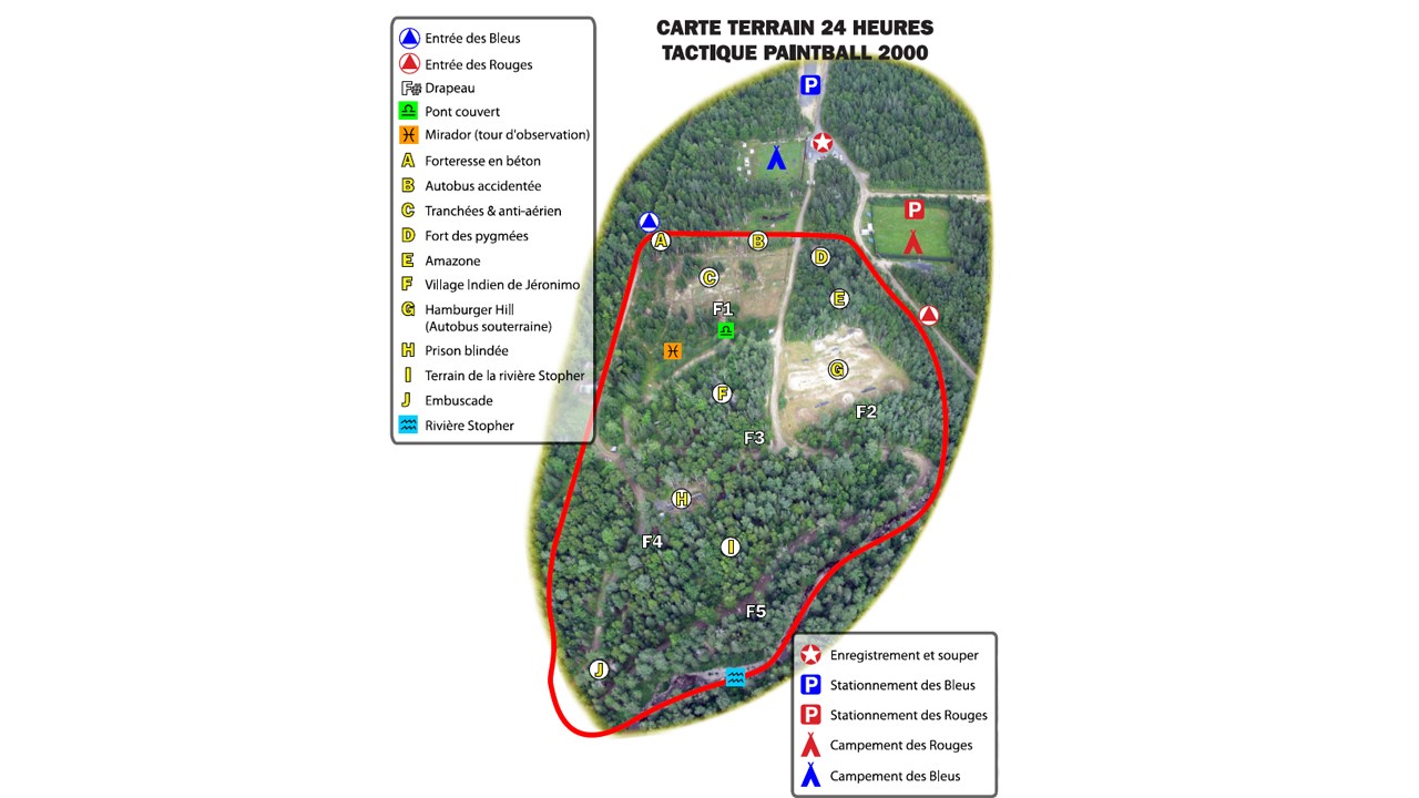 Pont couvert, tour d’observation, forteresses, tranchées et lieux d’embuscades, le terrain qui peut recevoir près de 120 personnes est entièrement dédié au plaisir des participants. De plus, divers scénarios ont été élaborés afin d’enchérir l’expérience du Paintball. Parmi ceux-ci, on y retrouve notamment des missions à la prison blindée, au village indien, à la rivière Stopher et au « débarquement de Normandie ». À cet effet, les groupes ne sont jamais laissés à eux-mêmes puisqu’ils sont accompagnés d’animateurs.