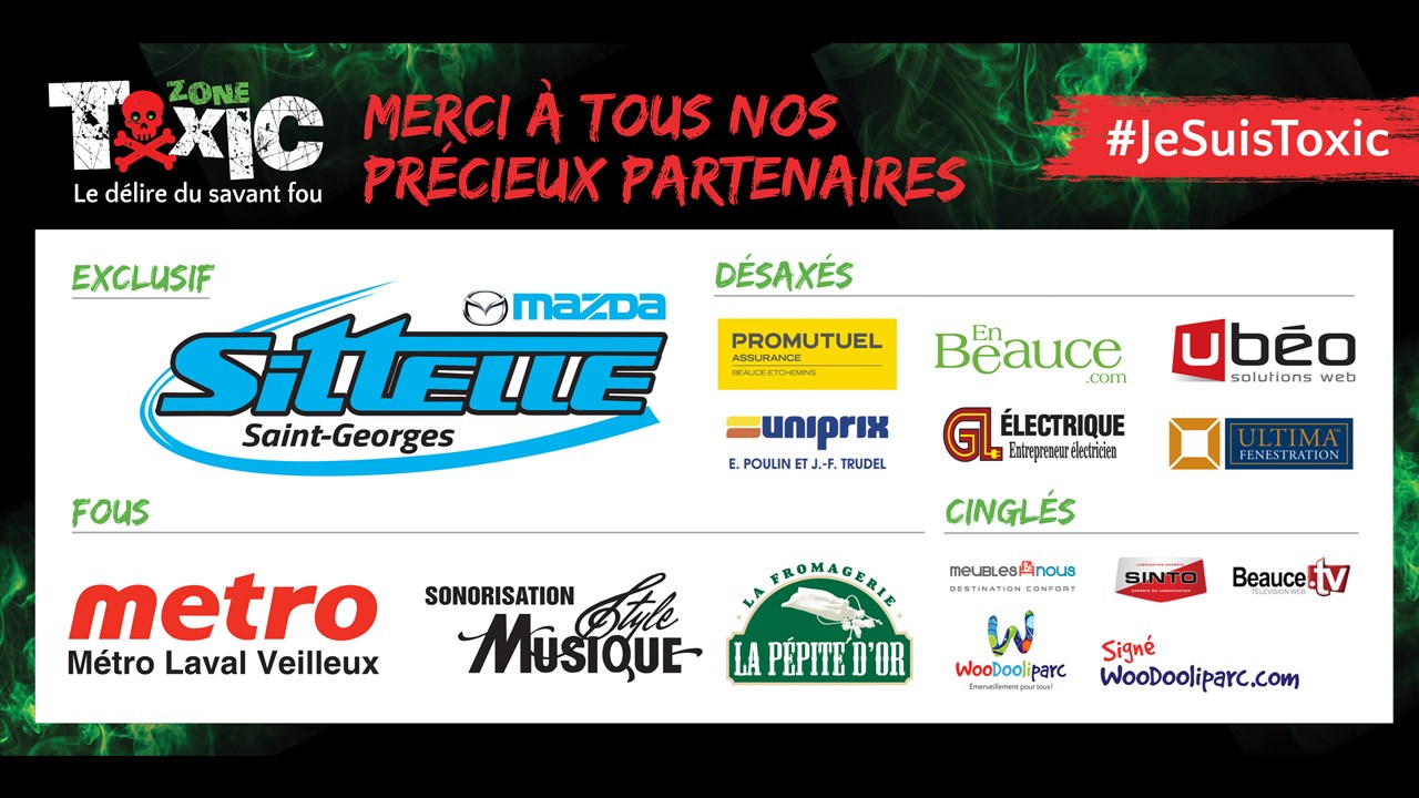 L'attraction « Zone Toxic » est rendue possible grâce aux partenaires suivants: Sitelle Mazda de Saint-Georges, Métro Laval Veilleux, Sonorisation Style Musique, la fromagerie La Pépite d'or, Promutuel Assurances Beauce-Etchemins, Uniprix Poulin et Trudel, EnBeauce.com, GL Électrique entrepreneur électricien, Ubéo, Ultima Fenestration, Meubles et Nous, Woodooliparc, Sinto, Beauce TV et Signé Woodooliparc.com.