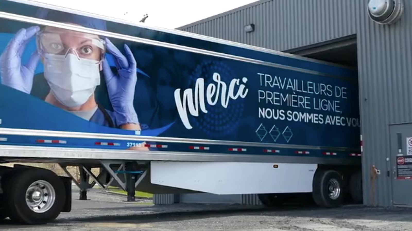 Le design des habillages est adapté en fonction de l’image de marque de chaque client. Chacune des remorques lance un message sous un thème différent qui adresse, non seulement l’engagement des camionneurs, mais également celle des autres travailleurs de première ligne de la pandémie de COVID-19.
