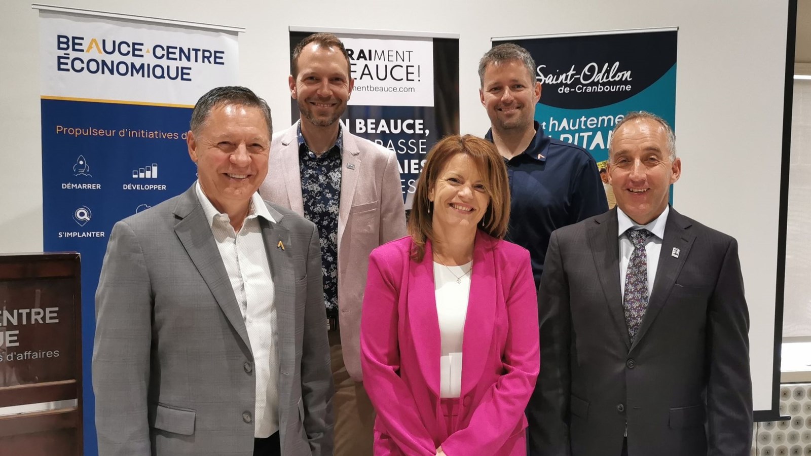 Mme Drouin entourée de Daniel Chaîné, directeur général de Beauce-Centre Économique, de Patrice Mathieu, maire de la Municipalité de Saint-Odilon-de-Cranbourne, de Sébastien Boily, représentant de Blanchette Vachon, partenaire officiel de la Soirée des Sommets, et de Pierre-André Bégin, président du conseil d'administration de Beauce-Centre Économique.