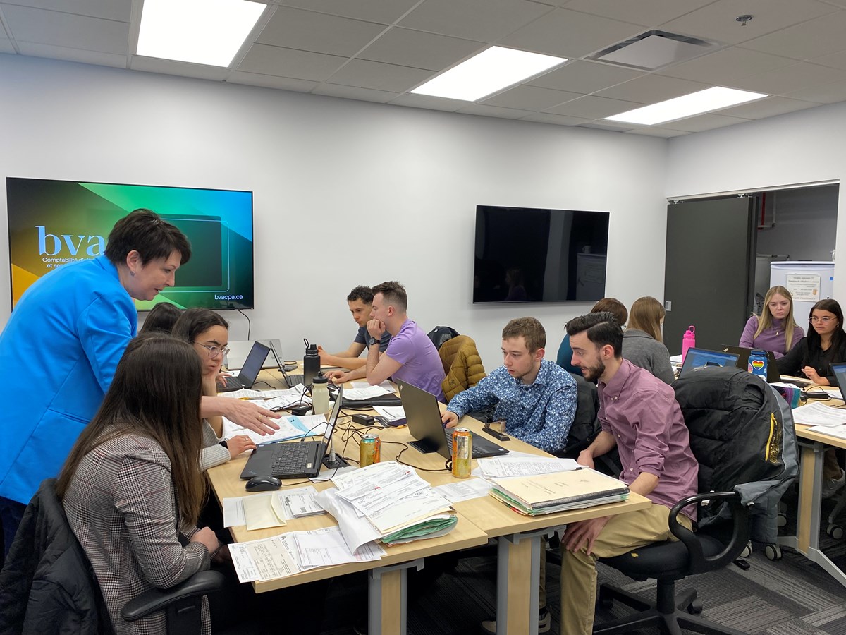 Dans le cadre du cours Impôts sur le revenu, ils ont pris en charge, en équipe, plusieurs déclarations d’impôts de particuliers. Sous la supervision du personnel enseignant et avec le soutien de spécialistes en fiscalité, chaque équipe était responsable de la classification des feuillets d'impôt, du tri de divers documents fournis par les clients et de l'entrée des informations dans le logiciel Taxprep.