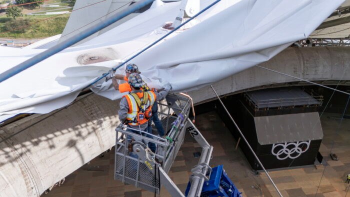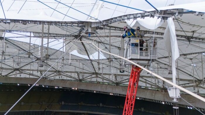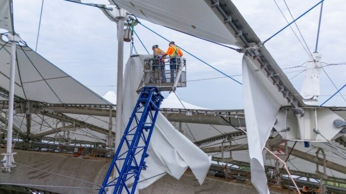 En effet, depuis le 11 juillet, les équipes s’affairent à démanteler la toile de Sheerfill blanche de la toiture de cette infrastructure iconique de la métropole, visible depuis l’extérieur.