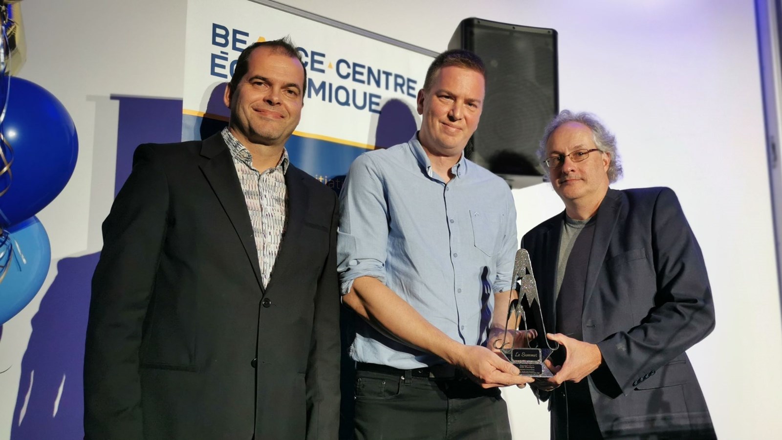 Le Sommet Innovation est allé à MBI Plastique, de Saint-Joseph-de-Beauce, représenté ici par Louis-Alexandre Jacques et Éric Veilleux. C'est Éric Brousseau, de Raymond Chabot Grant Thornton, qui a effectué la remise.
