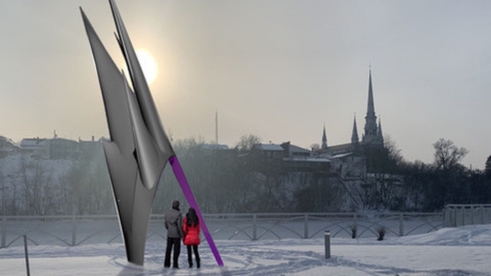 Ainsi, cette sculpture va se comporter dans le milieu urbain comme une architecture dynamique à l’intérieur de laquelle on pourra aller se recueillir. Vue d’un certain point de vue, sa nature formelle fait directement écho à la magnifique église de la ville sur l’autre rive.
