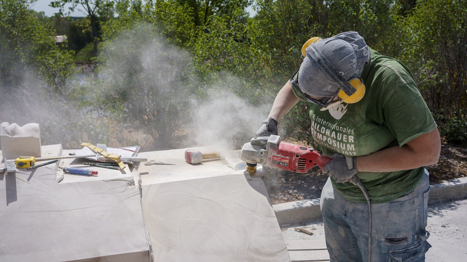 Je travaille avec plusieurs matériaux, mais je préfère la pierre. Chaque matériau à ses propres caractéristiques et c’est très intéressant. Mon premier souhait était de travailler du marbre de Cuba (ici à Saint-Georges), mais c’était trop cher alors ils m’ont demandé si c’était correct de prendre du calcaire, j’ai dit oui. C’est plus poussiéreux, plus mou aussi, même trop parfois. Il faut vraiment faire attention à la découpe, ça demande de la précision, il ne faut pas aller trop vite. J’ai toujours travaillé la pierre, je travaille aussi le bois, mais plus pour le fun.