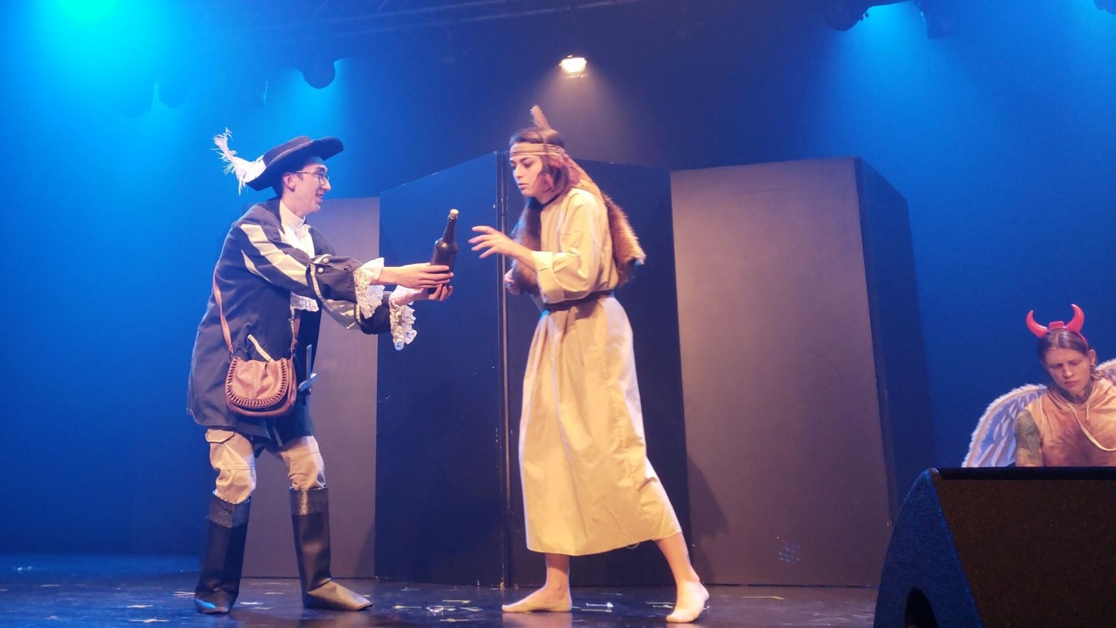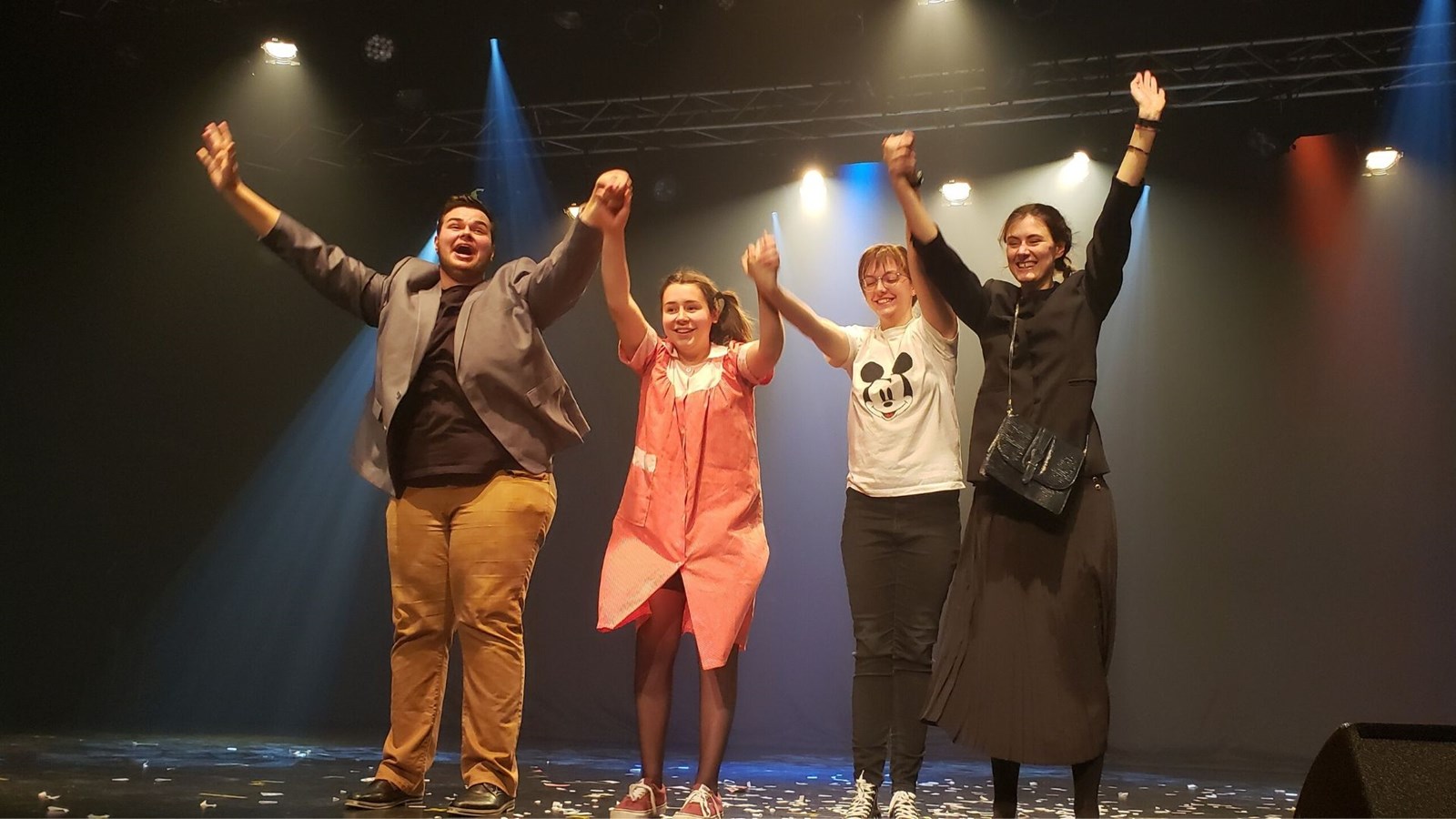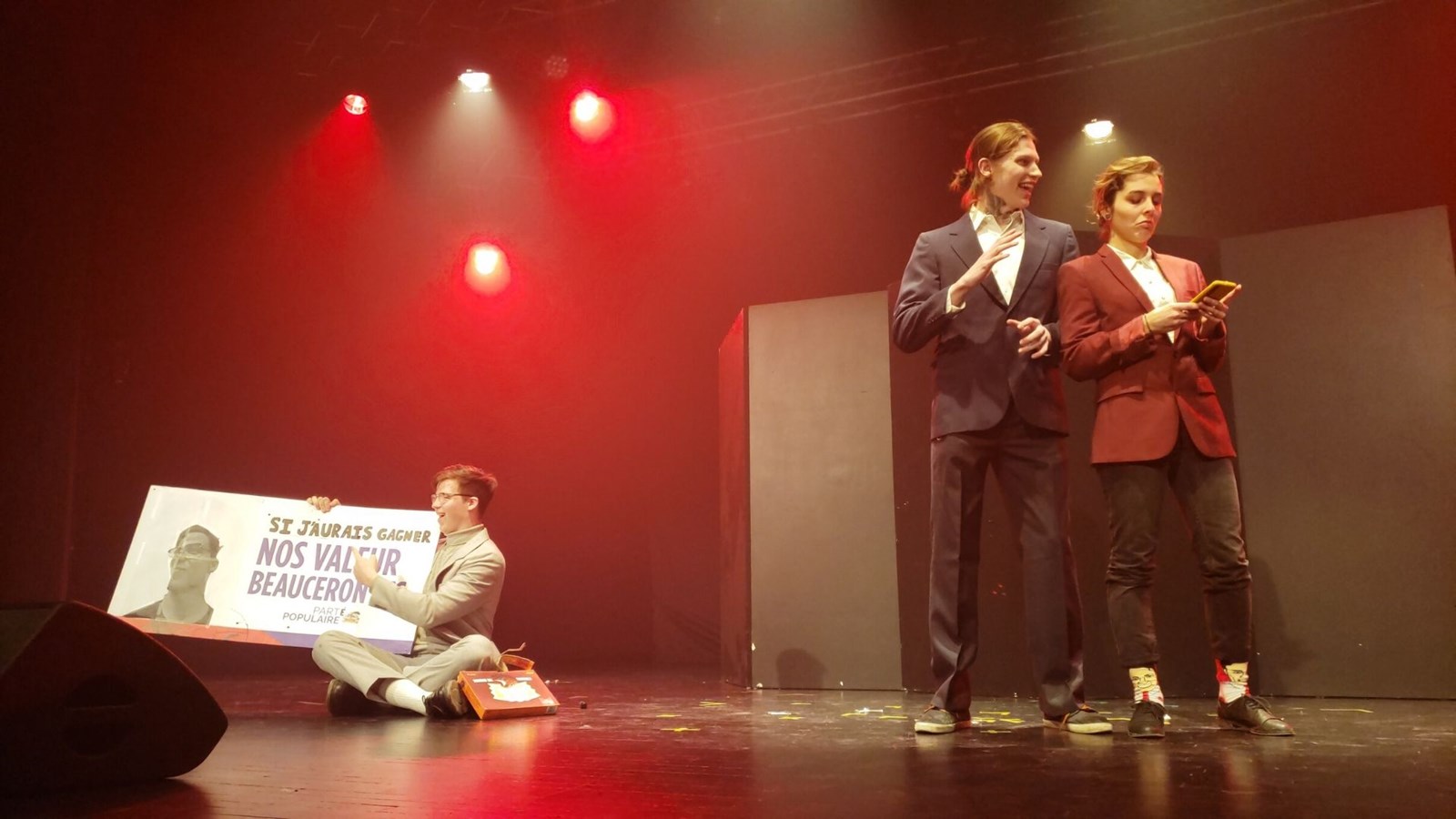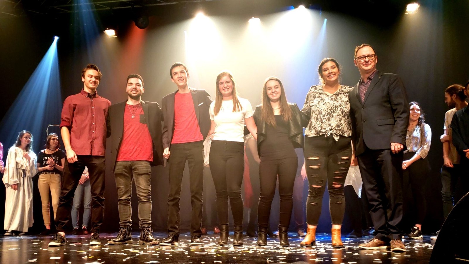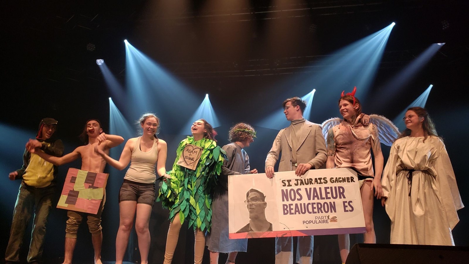 Le groupe de théâtre composé de Marie Boucher, Déreck Boudreault-Drouin, Kelly-Anne Bouffard, Léonie Champagne, Gabriel Côté, Jordan Côté, Olivier Fortier et Gabrielle Mathieu ont fait bien rire la salle avec leur pièce intitulée, « La dévolution ». Ils ont présenté avec humour des évènements d’histoire d’aujourd’hui jusqu’à Adam et Ève en touchant des thèmes qui préoccupent la génération des milléniaux. Rémi Jacques, alias DJ RJ qui est loin d’avoir l’allure que l’ont se fait d’un DJ a clôturé en faisant bouger les gens au rythme de la musique électro. Les spectateurs étaient très enthousiastes par cette performance.