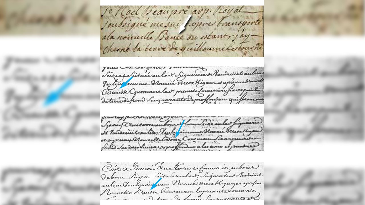 On est fiers d’être beaucerons. Mais d’où vient ce nom de Beauce? Cette appellation a son origine pendant la période où nous étions sous le régime français. Les historiens qui se sont penchés sur cette question croient qu’on a choisi ce nom en référence à la région de la Beauce en France, reconnue pour sa vocation agricole, traditionnellement alors surnommée le «grenier de la France» pour sa culture du blé. Bien que les paysages de la Beauce québécoise diffèrent énormément par la présence de la vallée de la Chaudière, c’est bien le potentiel agricole de ce nouveau territoire qui lui a valu de rendre hommage à cette région française si fertile. Quant à l’étymologie du mot, elle proviendrait du gaulois «belsa», qu’on pourrait traduire par «espace découvert». Ce serait à l’époque de la fondation de Saint-Joseph, en 1737, qu’on aurait commencé à utiliser l’expression «Nouvelle-Beauce». Mais il semble aussi qu’on ignorait son orthographe exacte de sorte qu’il y eut un certain flottement quand à la façon de l’écrire, ce qui transparaît dans les plus anciens documents qu’on a retracés à ce sujet. Voyez des extraits de quatre documents officiels anciens qu’on a découverts de cette période (document 2). En 1739, l’arpenteur Beaupré écrit «Bauce» dans un dossier d’arpentage. La même année, le notaire Barolet utilise des orthographes différentes dans deux contrats: «Beausse» et même «Bosse». Il continue de chercher et écrit «Bausse» en 1742 dans un autre contrat. Notez que sur les mêmes documents, on parle de «Nouvelle-Beauce» et non pas Beauce tout court. Ce n’est qu’après quelques décennies qu’on a laissé tomber le «Nouvelle» pour ne garder que Beauce. Une petite digression: Il y a quelques années, on a eu chez nous l’hebdomadaire «Beauce-Nouvelle», qui n’avait toutefois aucun rapport avec l’ancienne désignation (inversée) de notre comté. Ressemblance accidentelle, simple coïncidence.