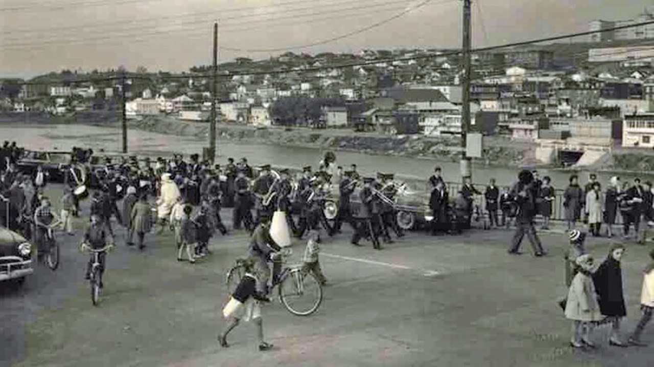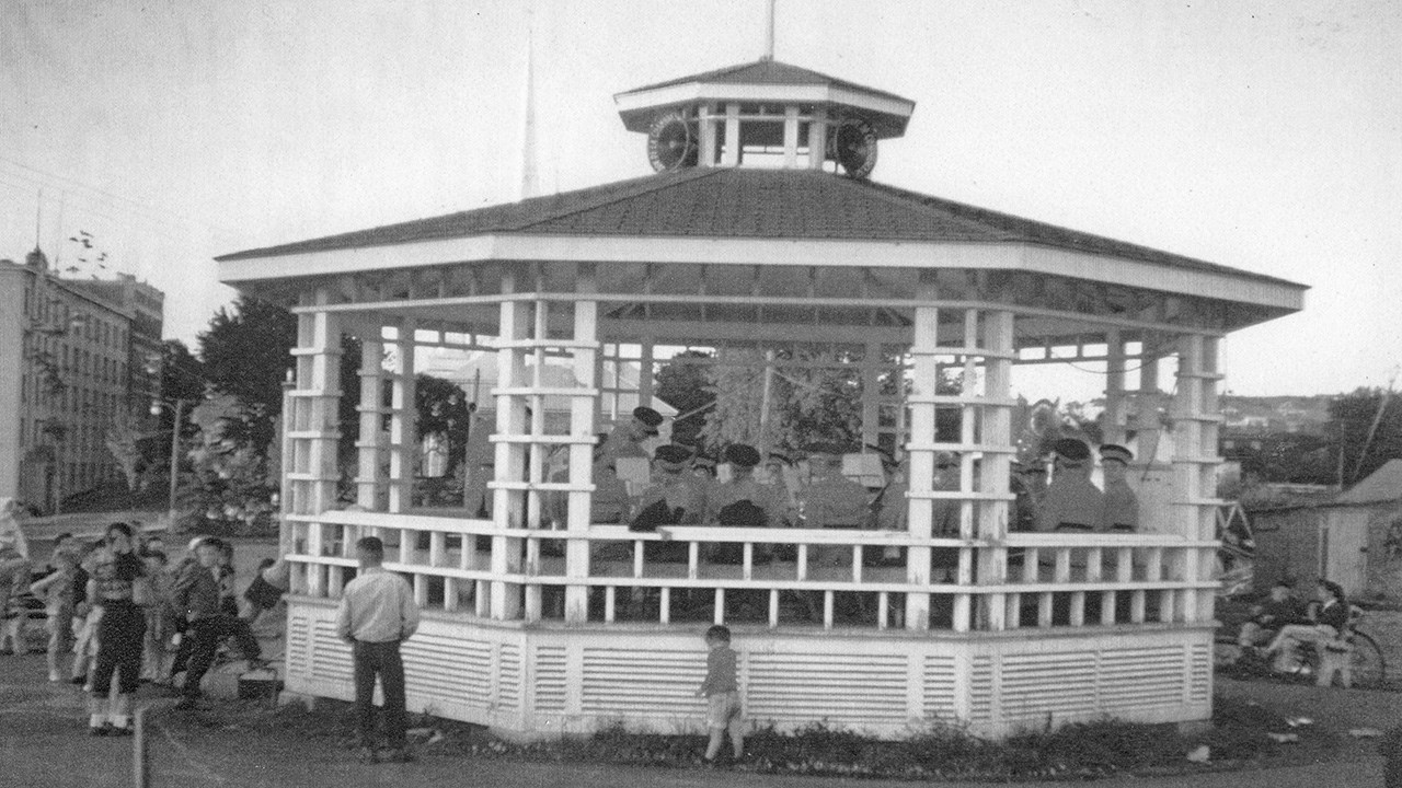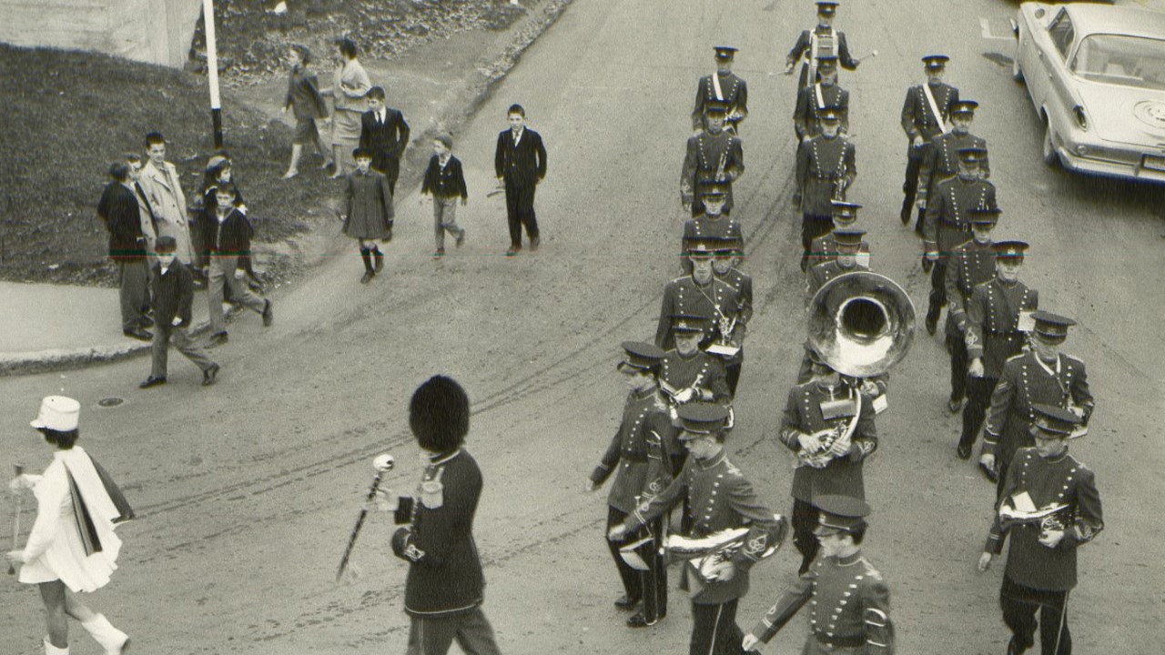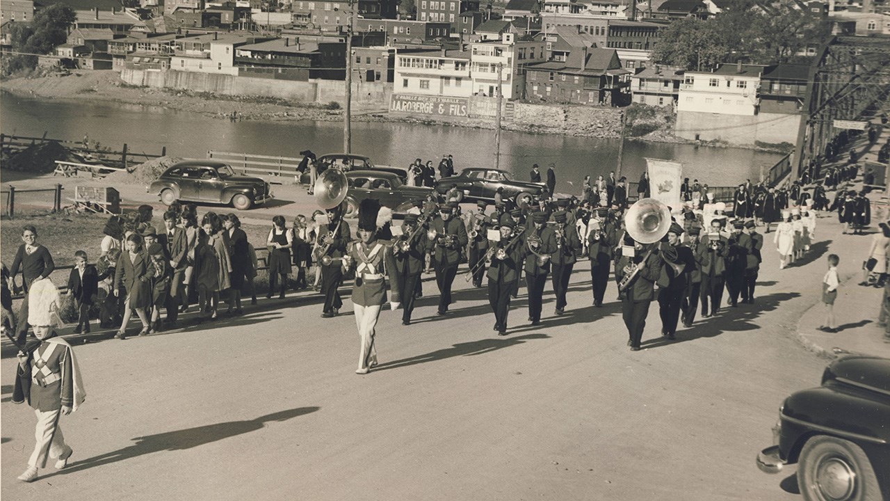 Suite à l’histoire de notre fanfare publiée dernièrement, voici quelques autres photos intéressantes. Notre fanfare offrait de superbes prestations en une foule d’occasions pour animer et égayer toutes sortes de festivités locales. D’abord dans la plupart des défilés et parades qui avaient lieu plus souvent qu’aujourd’hui dans les rues de notre ville. La première en est une autre montrant un spectacle présenté en juillet 1955 juste en face de l’église de l’ouest. Leurs costumes rouges étaient magnifiques. Mais étant confectionnés de laine, ils étaient terriblement chauds lors des démonstrations extérieures pendant la période estivales. C’était acceptable pour l’automne (photos 2 et 3 du 29 octobre 1960) mais difficilement supportable lors des parades estivales dans les rues, comme on le voit aux photos 4 et 5, prises en 1947. Sur la 6e photo, on les voit devant le restaurant Luncheonnette de la 2e avenue vers 1964, probablement prise à l’occasion de la démonstration offerte au moment où ils ont étrenné leur beaux costumes provenant du commerce voisin de ce restaurant, la Mercerie Sévigny. Ils ont aussi donné régulièrement des spectacles en plein air à l’ancien kiosque du Parc Bélair dans les décennies ‘50 et ‘60 (photo 7). Ils ont même offert une prestation lors d’une assemblée créditiste des Bérets Blancs probablement au début des années ‘50 (photo 8). Une autre photo nous les montre lors du spectacle présenté le 27 mai 1967 au cours de l’Expo ‘67 à Montréal (photo 9). La 10e photo semble aussi avoir été prise sur les terrains de l’Expo ‘67. Évidemment, le succès en ce domaine implique des pratiques fréquentes pour que tous les membres soient bien coordonnés et à l’aise de jouer tous ensemble en suivant les instructions du directeur. La 11e photo, de 1948, semble avoir été prise à l’occasion d’une pratique; wow, c’était il y a plus de 70 ans, c’est émouvant de voir tous ces géorgiens et géorgiennes réunis pour partager un si beau passe-temps. Une autre photo de groupe nous les montre encore tous ensemble devant l’ancien centre social des Chevaliers de Colomb en 1954, probablement dans les instants précédant un spectacle dans la grande salle (photo 12). Cet édifice fut démoli en 1988 pour y aménager un stationnement, il était situé en face d’où se trouve aujourd’hui le commerce Huguette Fleuriste.