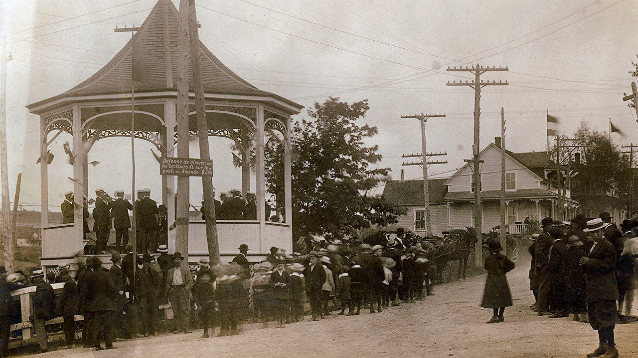 Certains se souviennent sûrement de ce kiosque qui était près du pont dans l’ouest, dominant la rivière, en face de l’église (photo 1). Il aurait été construit vers 1915 et a été un lieu de rassemblement pendant plusieurs décennies. Cette petite construction fut le théâtre de toutes sortes de manifestations politiques, artistiques ou récréatives. Autrefois, les candidats aux élections fédérales et provinciales y tenaient fréquemment leurs assemblées après la grand-messe du dimanche. On y assistait à des assemblées politiques et des discours patriotiques. Il n’était pas question d’amplificateur à cette époque et les orateurs devaient avoir la voix très puissante. De plus, on y affichait les avis publics (de même qu’à la porte de l’église et à celle du Dr Joseph Michaud dans l’Est). La fanfare de Saint-Georges s’est aussi produite très souvent à cet endroit, et ce sont d’ailleurs ces musiciens qu’on voit sur la 2e photo. Le soldat Lebrun a remporté un triomphe extraordinaire sur le plancher de ce kiosque au début de la guerre. On y a également présenté des concours d’amateurs, des séances de magie, des tours de force (avec Victor Delamarre entre autres) et des jeux acrobatiques. Remarquez l’écriteau près du kiosque, portant l’inscription suivante: «Défense de glisser sur les trottoirs et sur le pont - Amende de $5.00». C’était une somme substantielle à cette époque, on voulait sûrement que ce règlement soit respecté. Les deux premières photos, offrant une vue rapprochée du kiosque, ont été prises dans l’ouest en direction de l’est. Les deux autres ont été captées sous l’angle opposé, de façon éloignée; on peut y voir l’environnement du site où était situé le kiosque, respectivement aux environs de 1925 et de 1932. Vers 1960, on a déménagé ce kiosque au Camp Jociste, aujourd’hui appelé le parc des 7-Chutes. En voici la photo (photo 5). On le rafistola tant bien que mal en 1985, mais on rapporte qu’il fut démoli pour cause de vétusté vers 1990.