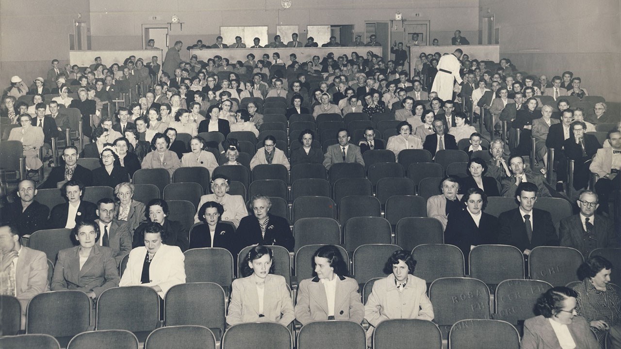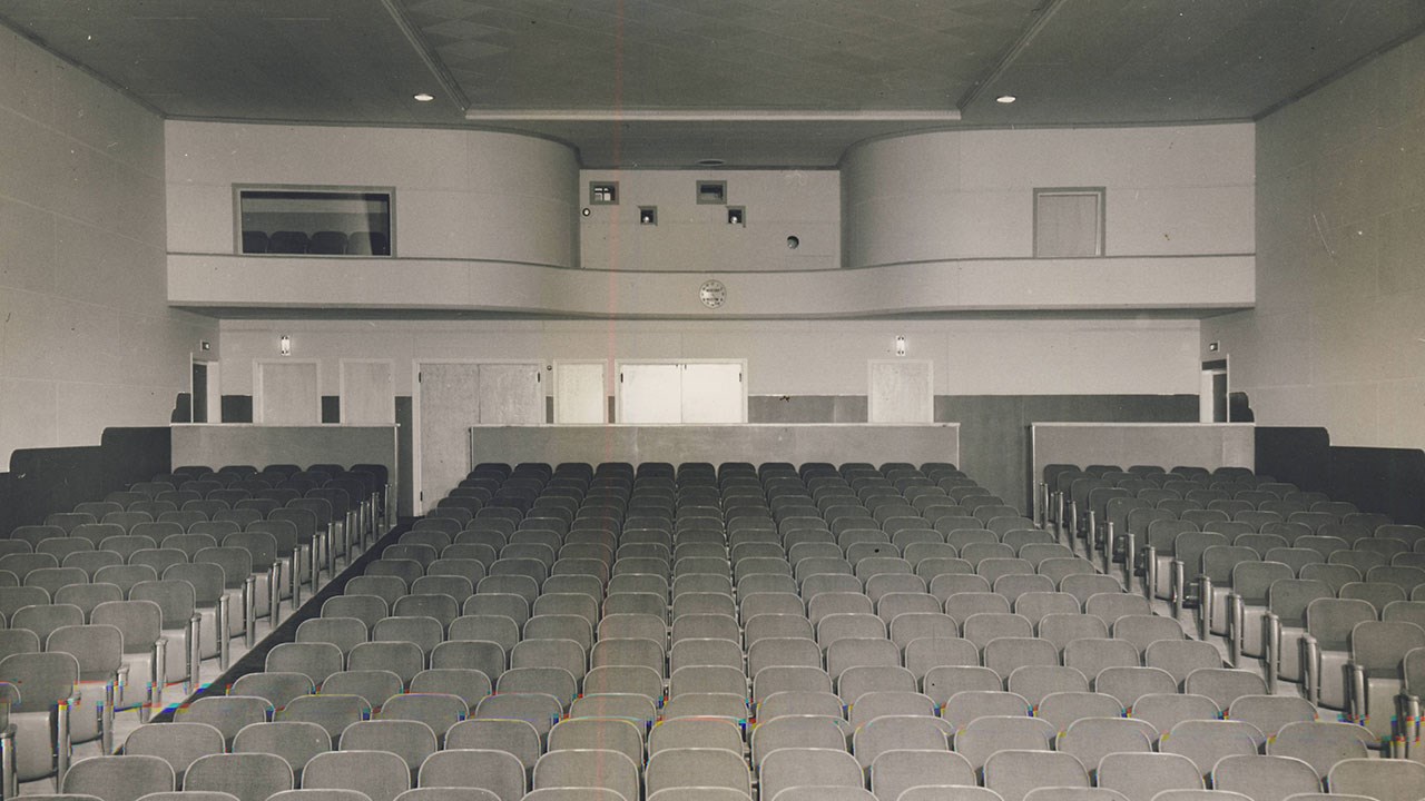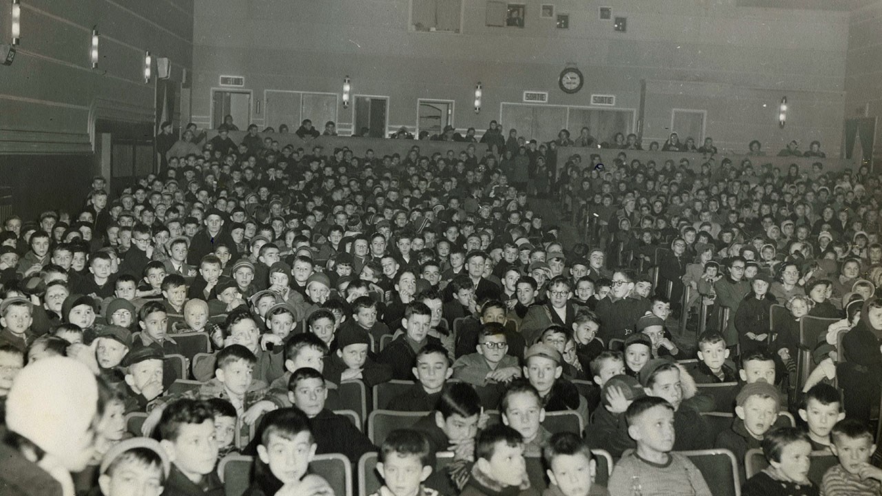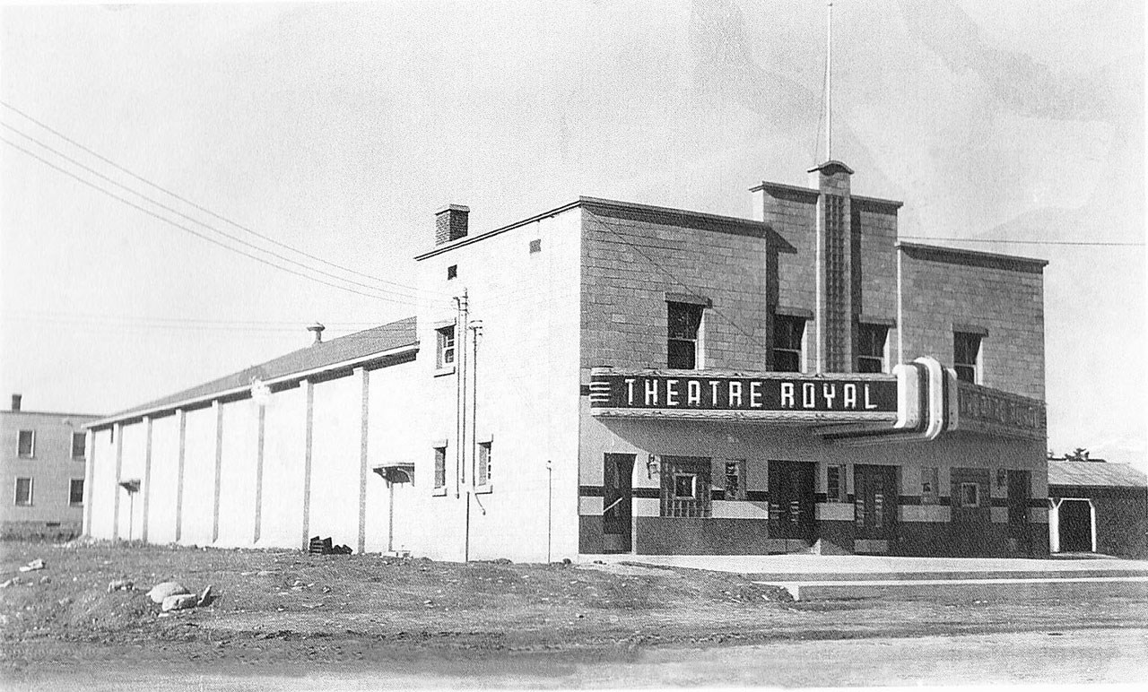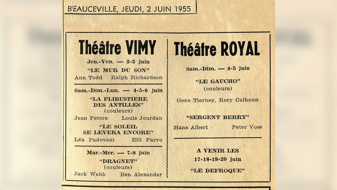 Lorsque vous circulez sur le pont en direction ouest et que vous continuez tout droit après la 1re avenue, vous arrivez ensuite à l'intersection du boulevard Dionne (feux de circulation). Vous êtes alors en face de l'édifice où fut longtemps situé le Théâtre Royal, soit au 1590 de la 6e avenue. Cet immeuble fut construit en 1947, année où la salle de cinéma y a ouvert. Il comptait 450 places. La première photo nous montre le Théâtre Royal vers 1970, et la deuxième vers 1955. À l'époque, on utilisait plutôt le mot «Théâtre» pour désigner les endroits où on pouvait assister à différentes activités et voir des films, comme on le constate à une publicité de 1955 (photo 3). D'ailleurs, la loi qui réglementait ce domaine s'appelait la «Loi sur les vues animées». Dans le temps, on ne disait pas qu'on allait au cinéma, mais on allait «aux vues». Ces anciennes appellations sont disparues graduellement, pour être remplacées par les expressions que nous utilisons encore aujourd'hui. Dans les années '30, l'homme d'affaire Armand Veilleux avait construit sur la 2e avenue la première salle de cinéma de notre ville du nom de «Théâtre Saint-Georges» dont nous voyons l'intérieur à la 4e photo. Il copia cet intérieur lorsqu'il érigea le Théâtre Royal. Plus tard, il a aussi été propriétaire du Cinéma Vimy, et il a ouvert le 22 mai 1970 le premier Ciné-Parc de la Province, soit le Ciné-Parc de Saint-Georges. Alors que le cinéma Vimy avait une allée centrale et deux allées externes, le Royal était divisé en trois et n'avait que deux allées. Dans les débuts, pendant longtemps, on mettait deux films à l'affiche au cours d'une même représentation, au coût de ... 25 cennes. On avait même droit à un «comique» (dessins animés) entre les deux.