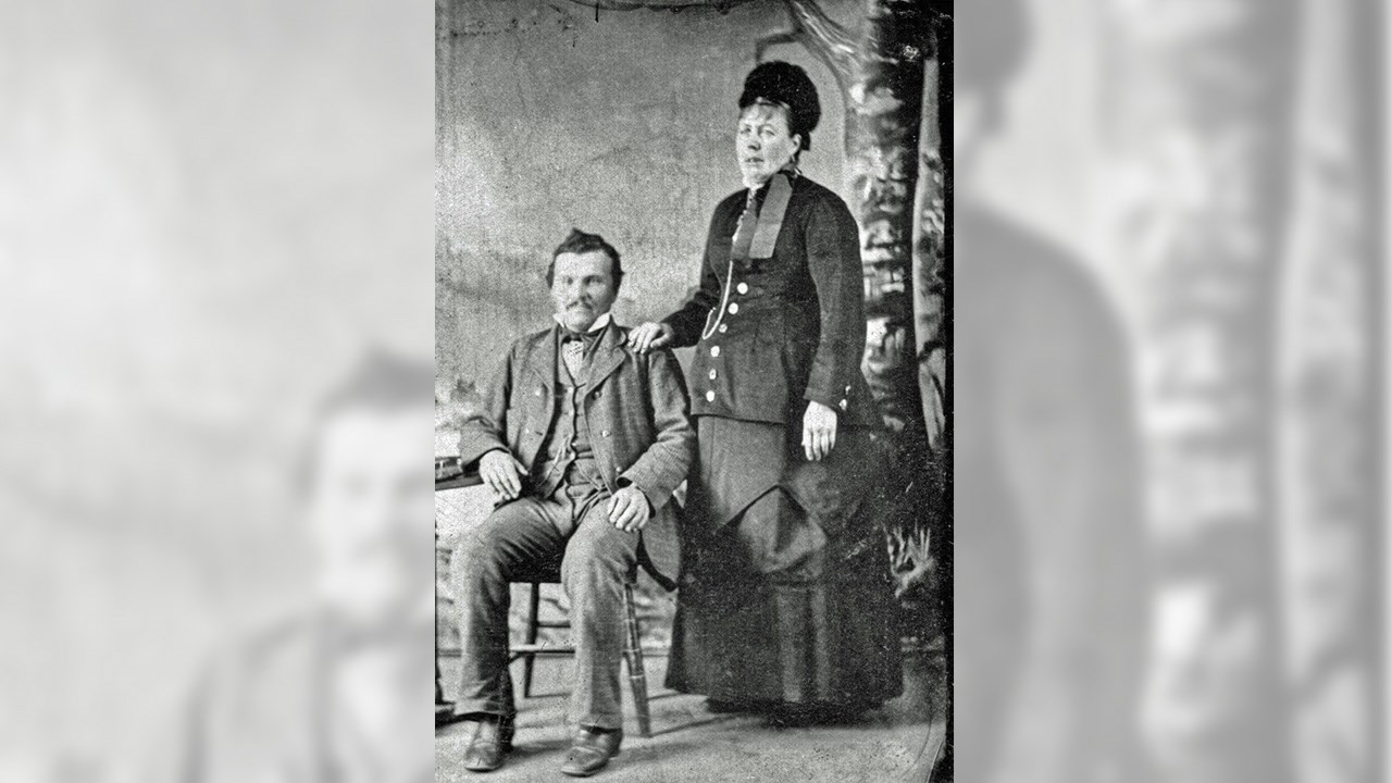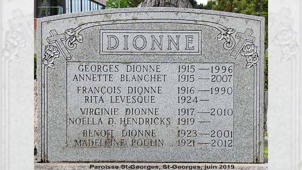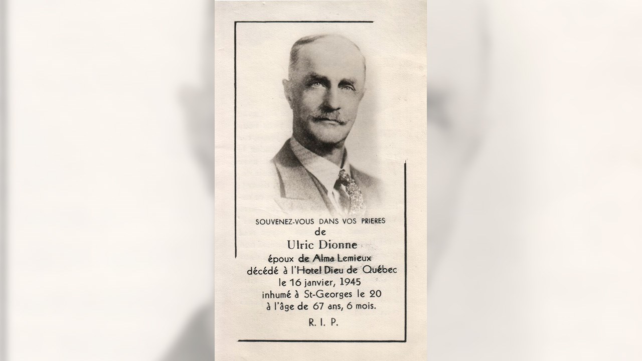 En fait, la maison est antérieure à 1879, car c’est la photo qui a été prise à cette date. C’est probablement une des plus anciennes photos d’une maison de Saint-Georges. On comprend qu’elle n’est pas d’excellente qualité, mais on peut se compter chanceux de l’avoir encore aujourd’hui. Elle aurait été prise le 4 août 1879, juste après le mariage du couple qu’on aperçoit en avant, ce qui explique que la dame portait une robe longue. Elle s’appelait Rose-Anna Déry. Et c’est son mari, qu’on voit en bas près de l’escalier, avec son chapeau sur la tête. Lui s’appelait Sieur François Lemieux. La maison semble en pierre et est d’un style très populaire à cette époque. On dirait qu’on a déposé et appuyé sous la fenêtre un joug d’attelage de boeufs, à l’envers sur la galerie. Cette résidence était située sur la rue Principale (maintenant appelée 1re avenue) à Saint-Georges Ouest, dans le secteur au sud de celle de Wenceslas Talbot, père de Mademoiselle Cécile Talbot, non loin de la rue Saint-Aubert (22e rue), quoique cette rue n’existait probablement pas encore à l’époque où fut prise cette photo. La 2e photo, un autre souvenir exceptionnel, nous les montre beaucoup plus clairement, lui à 35 ans et elle à 45 ans, madame avait 10 ans de plus que son époux. Alma, l’une des filles de ce couple, née dans cette maison, a épousé plus tard Ulric Dionne, et ce sont eux qui l’ont habitée après le décès de François et Rose-Anna. Ulric et sa femme ont eu à leur tour plusieurs enfants qui sont aussi nés dans cette résidence, soit Georges, François, Virginie, Noëlla, Benoit et Elzéar Dionne. La carte mortuaire d’Ulric Dionne indique qu’il est décédé le 16 janvier 1945 à l’âge de 67 ans (photo 3). Quant aux enfants, on voit quelques uns de leurs noms gravés sur leur monument funéraire dans le cimetière de Saint-Georges Ouest (photo 4). Hélas, il ne semble pas que cet immeuble existe encore aujourd’hui. On ignore si cette maison ancestrale a été incendiée ou détruite. On sait qu’il y a eu un gros feu sur la 1re avenue le 10 septembre 1913 dans les environs de la 25e rue, ayant détruit plusieurs maisons, dont celles de Moïse Poulin (père de Cléophas), Jos Quirion, Charles Lachance et graves dommages à celle de Joseph Rodrigue. Malgré nos recherches, on ne connait pas leur localisation exacte.