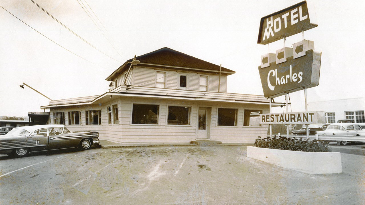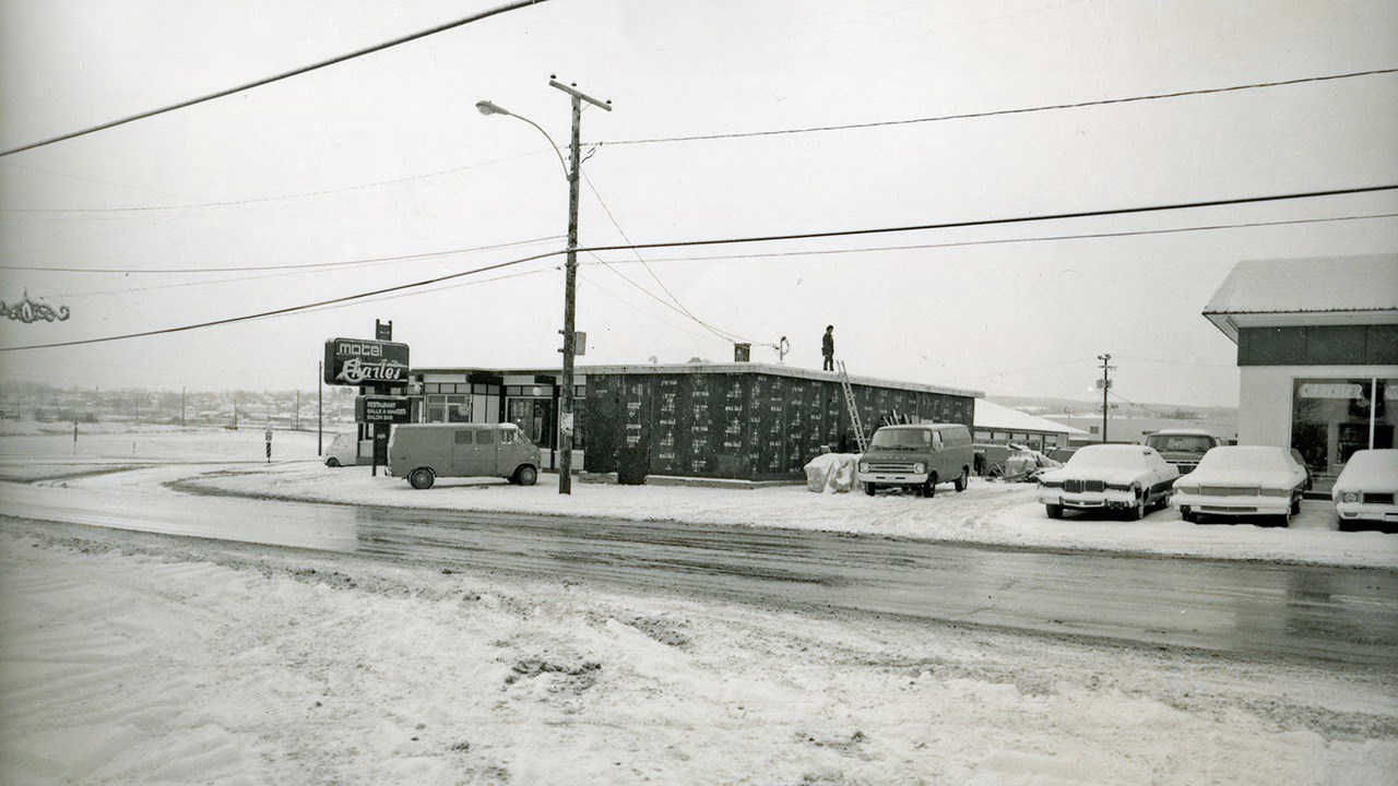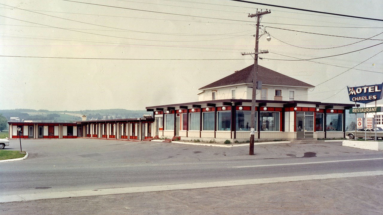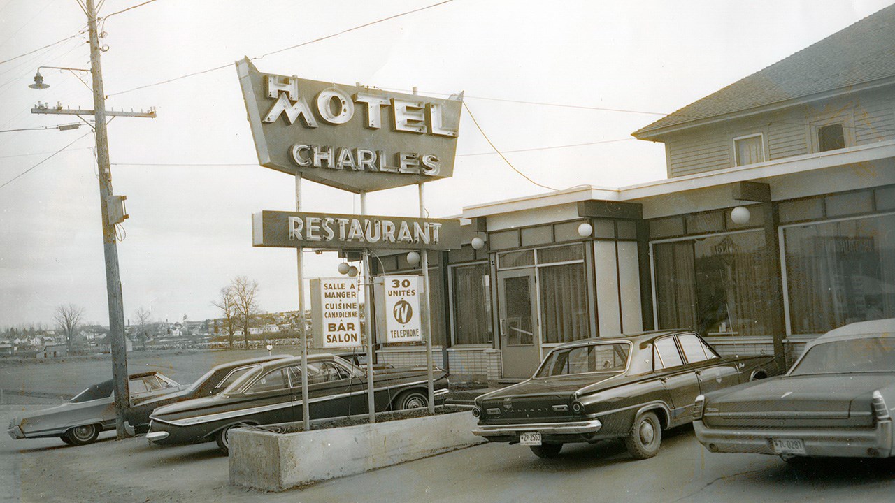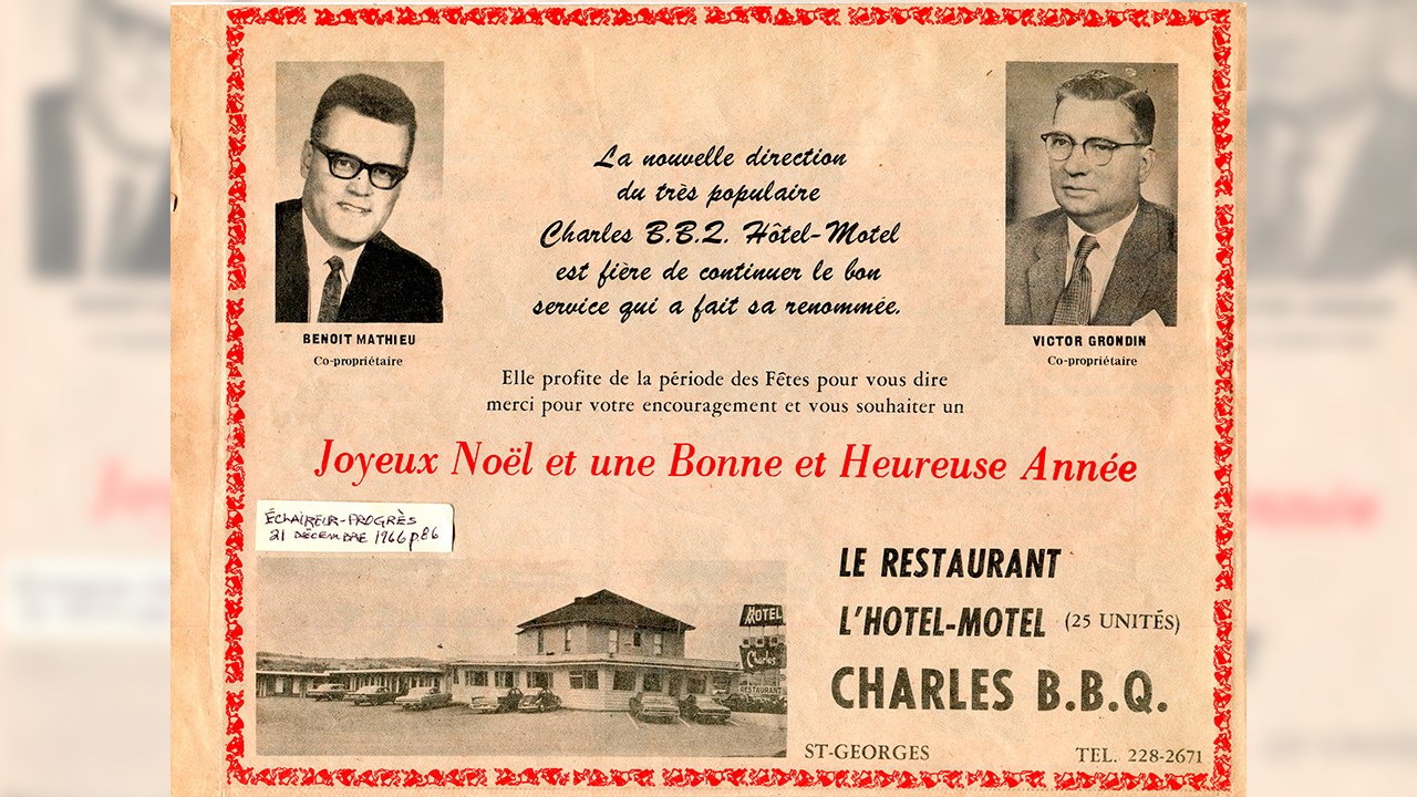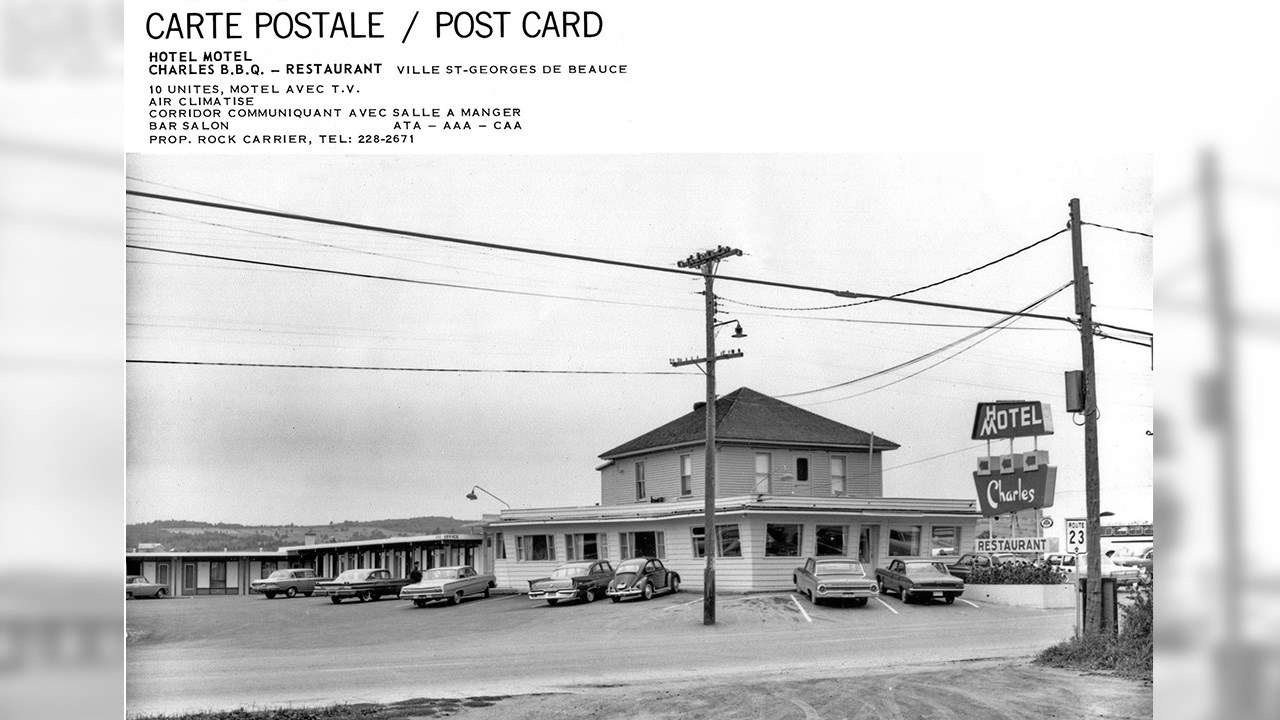 Le souvenir de ce renommé restaurant est encore frais dans la mémoire des géorgiens puisqu’il a existé jusqu’à tout récemment. Tous l’ont connu car il a fait partie du paysage urbain pendant environ cinquante-cinq ans. Il fut fondé en 1956 sous le nom du restaurant « Charles BBQ» (photo 1). Ce restaurant ayant été une véritable institution chez nous, voici la photo des deux plus importants personnages de son histoire, le fondateur Charles Doyon (à gauche) et Jimmy Poulin qui en a pris les rênes en 1968 (photo 2). Au moment de sa fondation, en 1956, c’était simplement une grosse résidence carrée (achetée de Stanislas Fortin qui en avait hérité de son père Sévère Fortin) à laquelle M. Doyon ajouta un agrandissement très fenêtré vers l’avant. C’était aussi un bar, comme c’est indiqué à l’enseigne devant l’édifice. Voyez l’intérieur, incluant un comptoir avec tabourets pivotants (photo 3) ainsi que la cuisine originale (photo 4). Vers 1958, on y ajouta une section de 10 unités de motels, et suite à cet ajout, on changea l’enseigne pour y annoncer que c’était alors un Hôtel-Motel, comme on le constate à la 5e photo. Vers 1964, Rock Carrier se porta acquéreur de ce commerce. Il fit imprimer des cartes postales affichant l’image apparaissant à la 6e photo, à l’endos de laquelle on voyait la description des services offerts. On a la chance d’avoir une photo de l’équipe qui était à l’oeuvre en décembre 1964 (photo 7). Cette entreprise changea de main à nouveau en décembre 1966, voyez la publicité parue à cette occasion dans la livraison de l’Éclaireur-Progrès le 21 décembre 1966 (photo huit). On constate que le motel comprenait alors 25 unités. Les acquéreurs étaient Benoit Mathieu et Victor Grondin. Ceux-ci apportèrent d’importantes améliorations, dont l’addition de nouveaux motels et, en novembre et décembre 1967, le remplacement du revêtement extérieur par des murs en briques. Voyez la photo de la façade vers 1968, annonçant 30 unités de motels munis du téléphone et de la télévision (photo 9). C’est en 1968 que les trois frères James (Jimmy), Lawrence et Armand Poulin sont devenus propriétaires de cet établissement hôtelier. La renommé du chef cuisinier Jimmy augmenta considérablement l’achalandage. Ceux-ci n’ont cessé de rénover et améliorer leur entreprise. On a démoli le 2e étage lors de l’agrandissement de 1974, qui a nécessité un investissement de 300,000$ (photo 10). En 1978, Les deux fils Richard et Yvon se sont associés à leur père Jimmy pour poursuivre les activités. L’édifice a continué de se moderniser. Voyez une section des tables et banquettes à une certaine époque (photos 11). En décembre 1995, deux employés de longue date se sont joints à l’équipe d’actionnaires, soit Lucille Baillargeon serveuse depuis plus de 25 ans ainsi que le cuisinier Richard Rosa. Ce fut une belle époque, c’était un superbe établissement, propre et bien tenu. En dernier, cette entreprise était un peu à l’étroit, coincée entre les rues et le concessionnaire d’automobile voisin. Les actionnaires ont finalement accepté de vendre au garage adjacent Chrysler. Une dernière image de ce lieu mythique (photo 12). Ce bel immeuble renfermant tant de souvenirs fut démoli dans la journée du 16 décembre 2011. Une page de l’histoire de Saint-Georges s’est alors tournée définitivement.