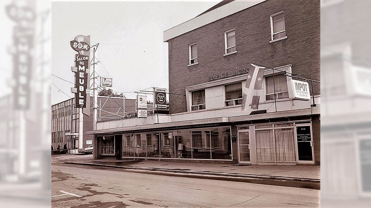 À l’origine, en 1921, cet imposant édifice fut érigé par les Chevaliers de Colomb. Aux prises avec des difficultés financières, ils le vendirent à Édouard Lacroix en 1926 pour environ 30,000$ qui représentait la dette. C’est devenu un immeuble polyvalent, principalement des bureaux. À partir de 1962, le magasin Salon du Meuble occupa ces lieux pendant plusieurs années; on le voit à la 4e photo qui date de la fin des années ‘60, remarquez que le nom officiel était inscrit sur la façade en grosses lettres «Édifice Lacroix». Vers 1970 fut créée la Caisse Populaire l’Assomption qui occupa un local sur le coin nord, au rez-de-chaussée, jusqu’à ce qu’elle se construise une nouvelle bâtisse en béton (inaugurée le 8 septembre 1973) sur la 1re avenue plus au sud, en face du magasin actuel Confections Simonne. Vers 1985 un Marché aux Puces s’installa au 2e étage de l’Édifice Lacroix. La fin est survenue le 14 février 1994 lorsque l’immeuble qu’on appelait encore «l’Édifice Lacroix» fut démoli. Aujourd’hui, c’est sur ce site que se trouve la résidence Le Jasmin.
