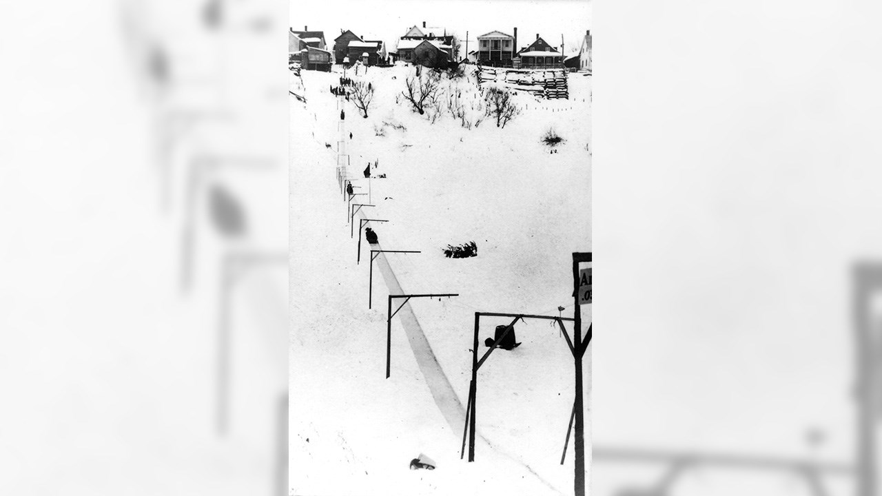 Voila une publication représentant une scène d’autrefois que bien peu ont vue de leurs yeux: la fameuse glissade Molson qu’on a aménagée sur la rivière vers 1950 (photos 1 et 2). Comme on peut le voir, elle était placée au sud du pont, partait d’en arrière de la maison d’Aloysius Dionne dans l’ouest et arrivait aux environs du pied de la 125e rue du côté est. Cette attraction était commanditée par le brasserie Molson, ce qui explique son nom. Remarquable pour l’époque: elle était éclairée en soirée, comme le démontrent les lumières suspendues à la ligne accrochée aux piquets encastrés dans la neige. On constate que la piste était encavée dans la neige et que les amateurs devaient utiliser les traineaux fournis par les organisateurs, que l’on voit au premier plan. L’accélération devait être vertigineuse lorsqu’on arrivait en bas de la pente abrupte de la rive ouest, puisque l’élan était tel que les glisseurs pouvaient presque traverser complètement le couvert de glace enneigé de la rivière jusqu’à la rive opposée. C’était avant l’arrivée de la piste de ski, qui a l’avantage de ramener les randonneurs en haut de la pente après chaque descente. Ici, les gens avaient l’inconvénient de devoir retourner à pied à chaque fois qu’ils voulaient recommencer leur descente, à moins qu’une âme charitable les ramène en auto sur le haut de la pente en faisant le tour par le pont. Wow, c’était du sport, les géorgiens savaient profiter de l’hiver autant à cette époque que de nos jours.