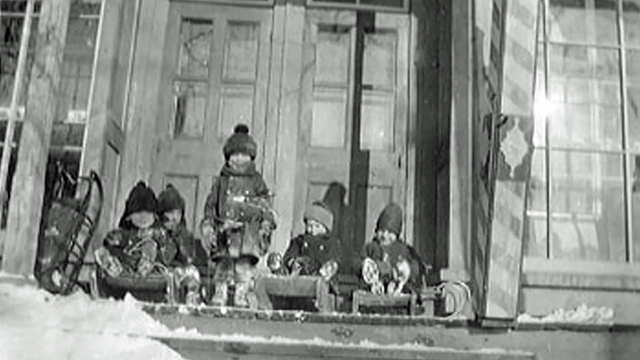 Sur la 3e photo, prise vers 1930, cinq jeunes enfants prêts à partir glisser prennent la pose sur la galerie du photographe J.A. Gagnon, dont l’édifice existe encore sur la 1re avenue, en face du magasin Chaussures Cameron. Probablement des petits Roy, Moisan et Méthot qui résidaient tous dans le voisinage. Cette superbe photo a dû être prise par l’épouse ou la fille de J.A. Gagnon. Remarquez comme ils étaient chaudement vêtus, ces jeunes devaient être heureux de passer de beaux moments à jouer dehors au grand air avec leurs amis.
