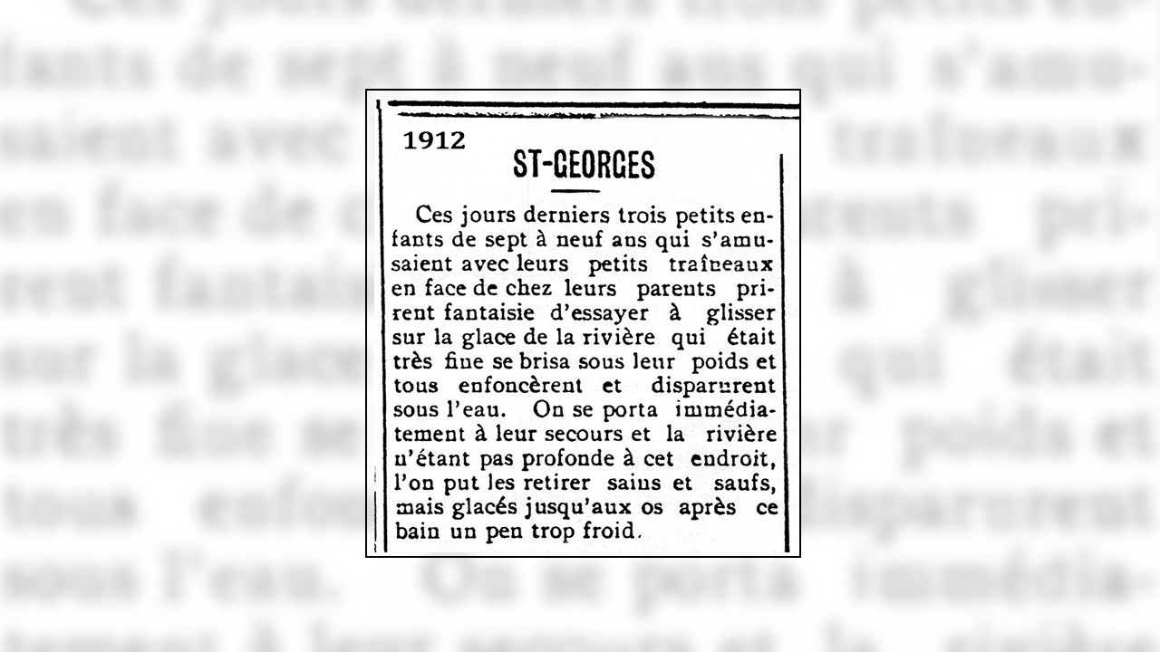 Un incident malheureux impliquant trois jeunes enfants qui glissaient près de la rivière eut lieu en 1912. Lisez l’article (photo 4) publié dans le journal local de Saint-Georges à l’époque, qui raconte cette mésaventure qui eut toutefois une fin heureuse. Les trois jeunes, qui ont dû donner une frousse terrible à leurs parents, furent sauvés in extremis. Ce fut sûrement pour eux une leçon pour la vie.